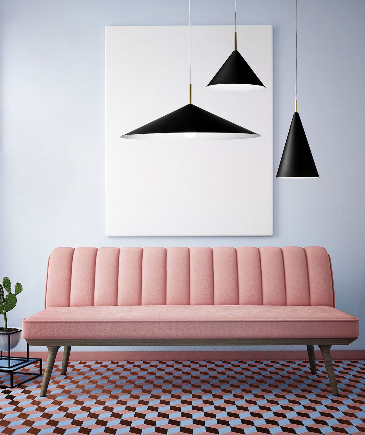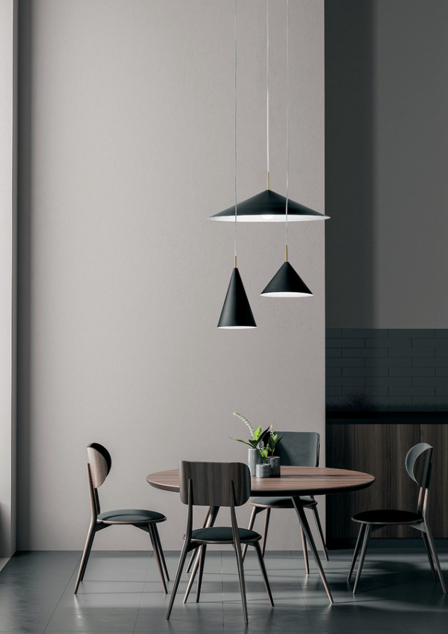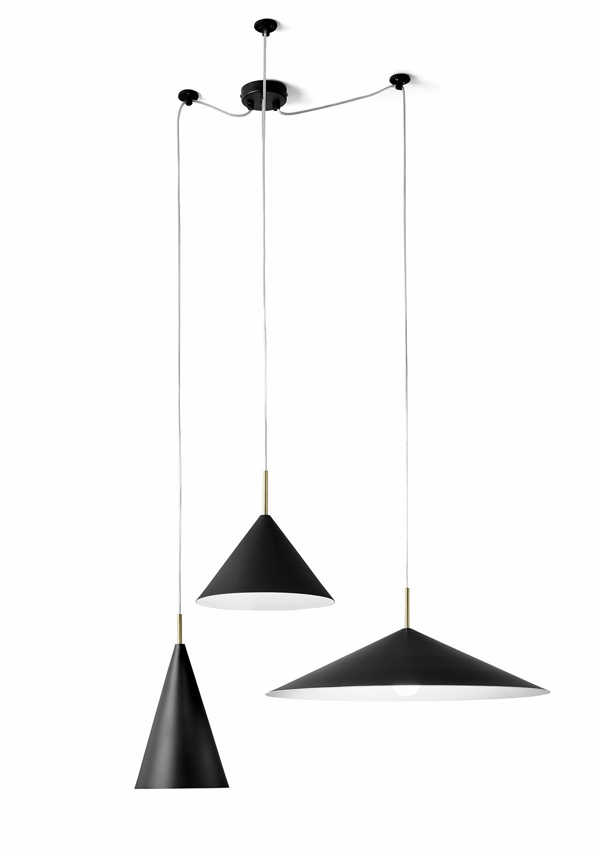 Pendente de 3 luzes em metal revestido a metal escovado preto: acabamento preto suave no exterior, branco no interior.