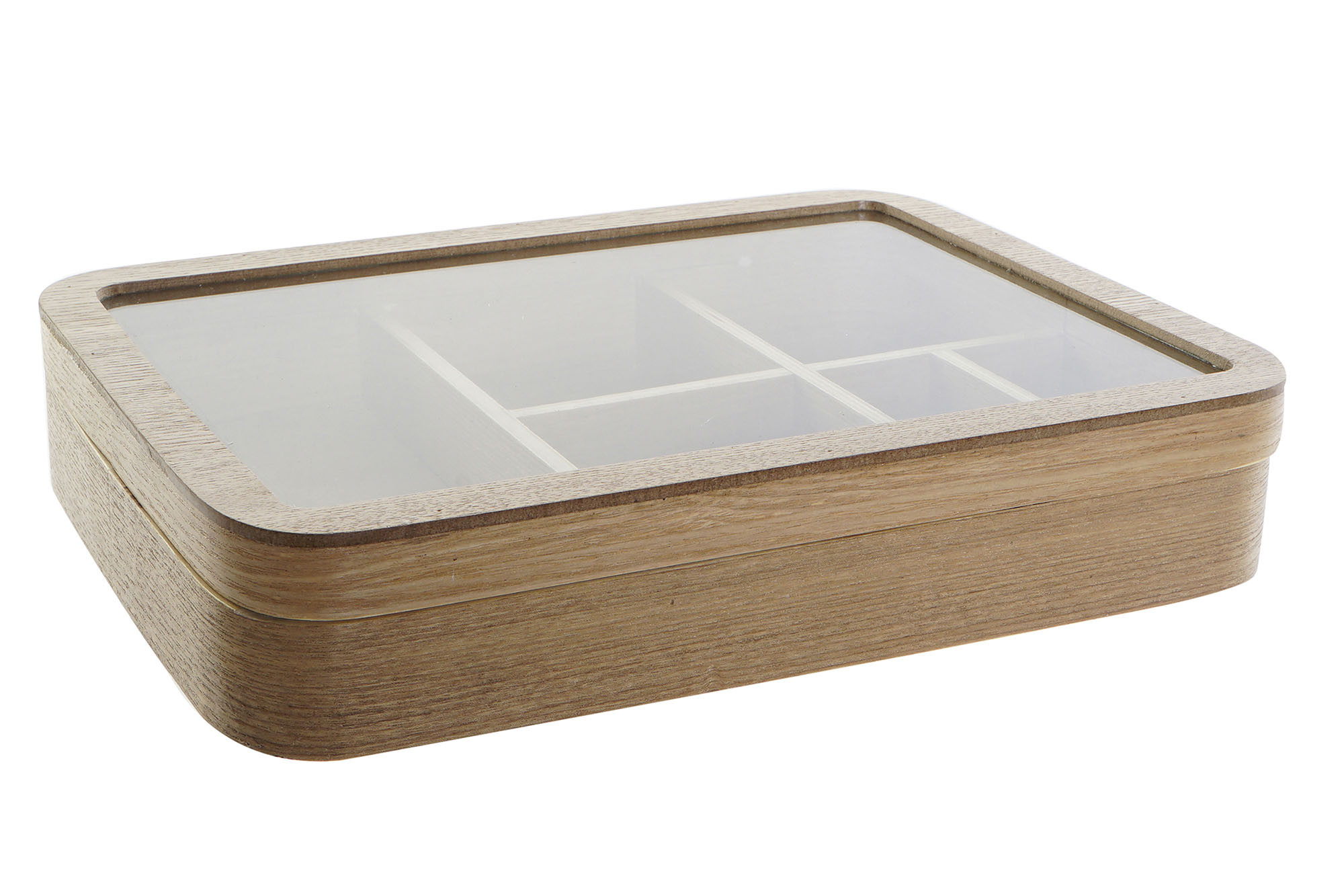 Joalheiro dividido em compartimentos, feito em bambu e tampa em vidro.