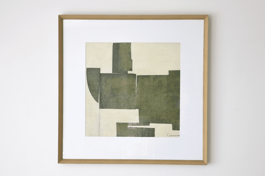 ACRÍLICo SOBRE TELA. PINTado À MÃO com FORMAS GEOMÉTRICAS com tons DE VERDE E CREME. MOLDURA EM VIDRO E com ACABAMENTO COR DE MADEIRA.