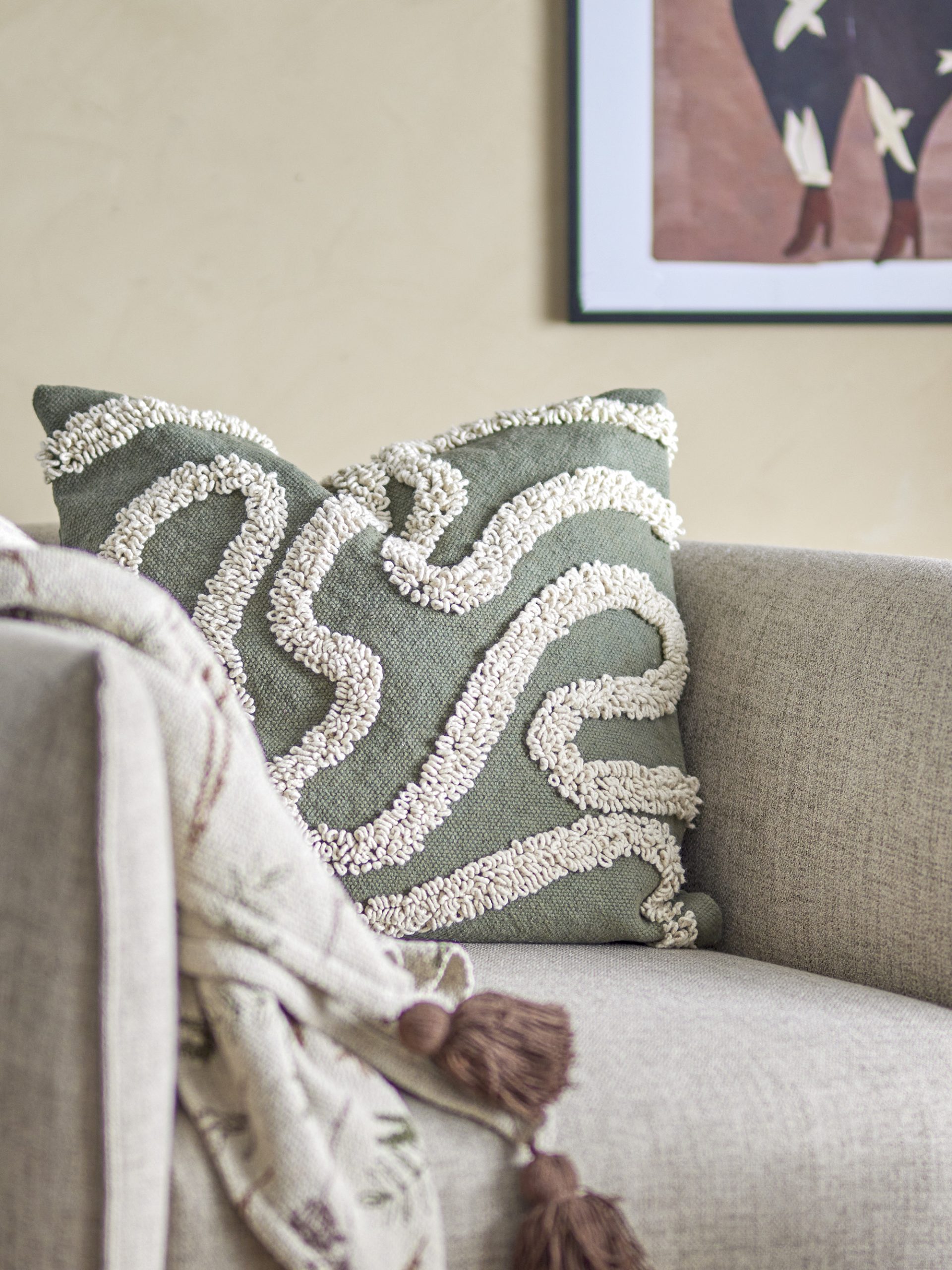 A Almofada Mirfield da Bloomingville é feita de algodão na linda cor verde escuro, adornada com um padrão tufado em formato orgânico e cor clara.