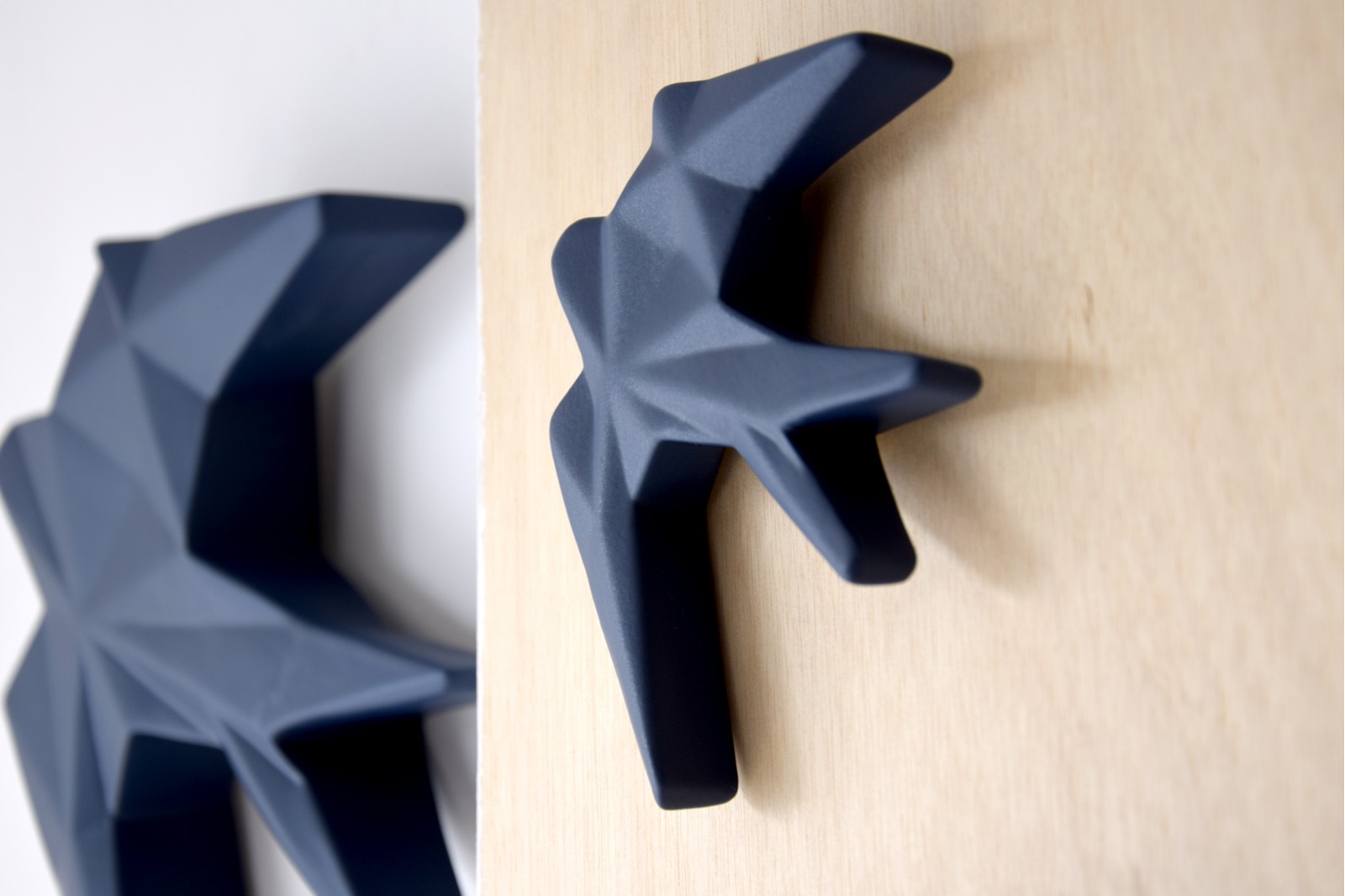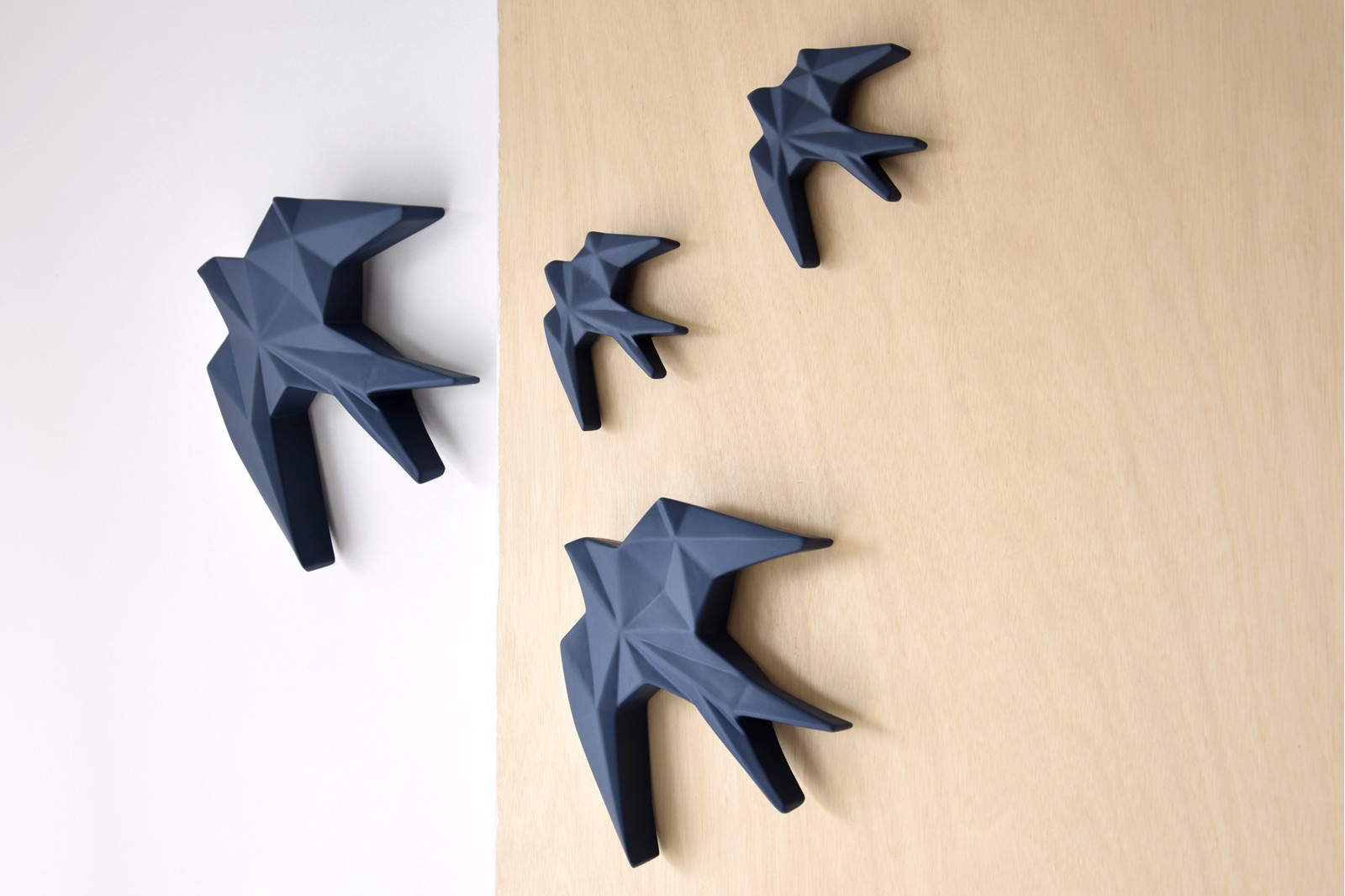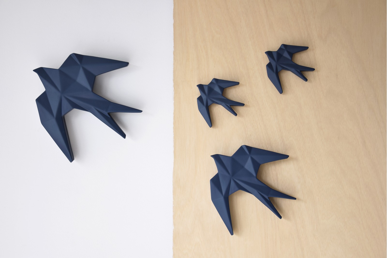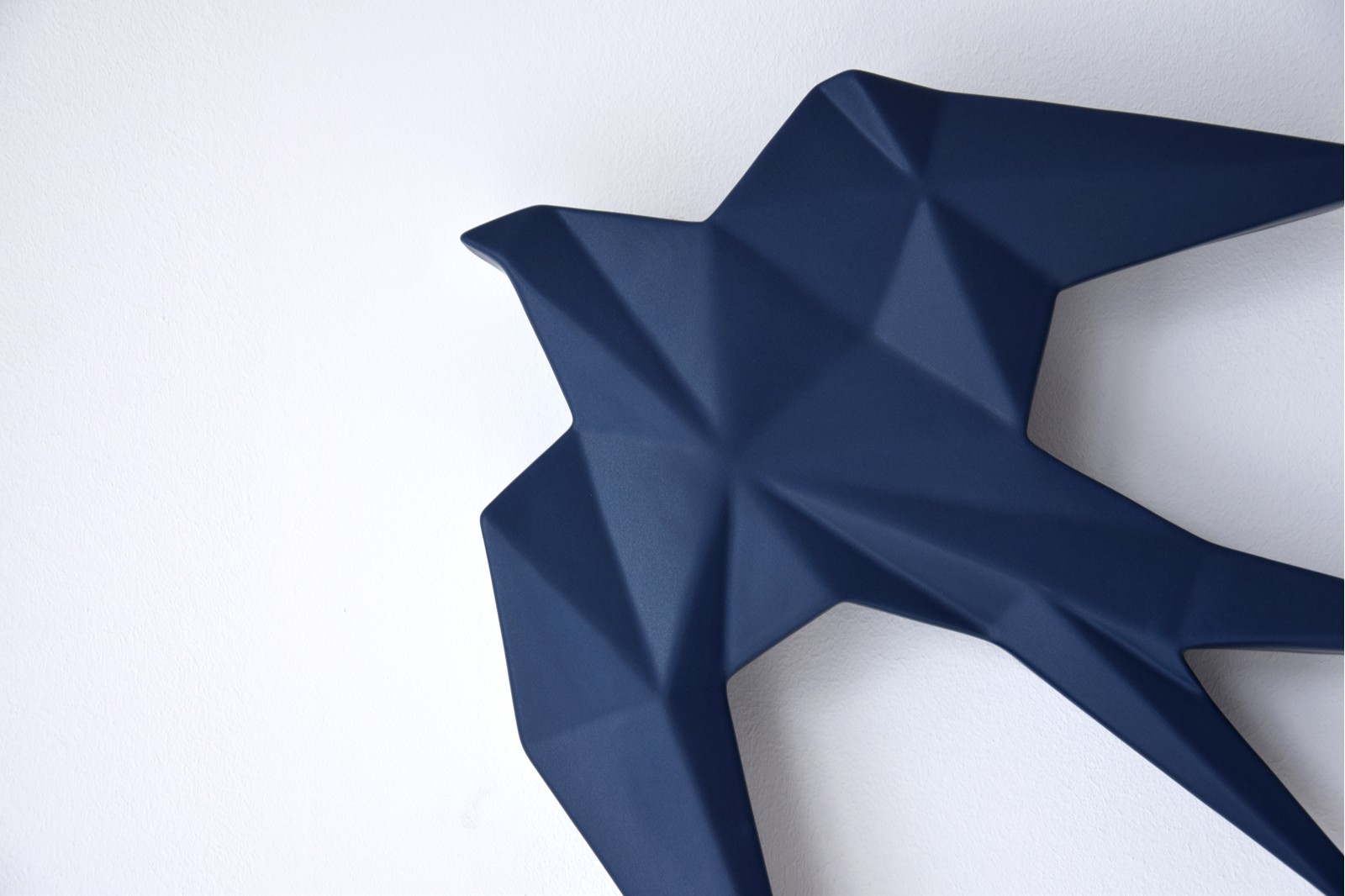 Andorinha para pendurar na parede produzida em cerâmica azul acabamento mate. A sua produção artesanal e a aplicação totalmente à mão da cor convertem cada peça num elemento único obtendo diferentes matizes da cor que proporcionam um efeito singular a cada espaço.  A técnica de vidrado suporta pequenas variações de cor.