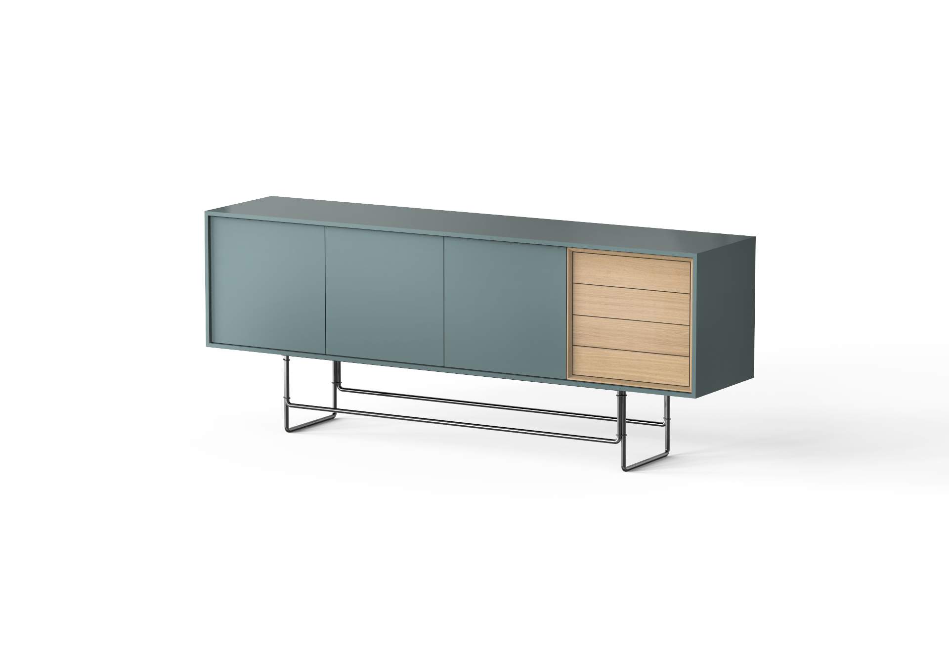 Estrutura e frente lacado, nicho em carvalho e pés em inox.