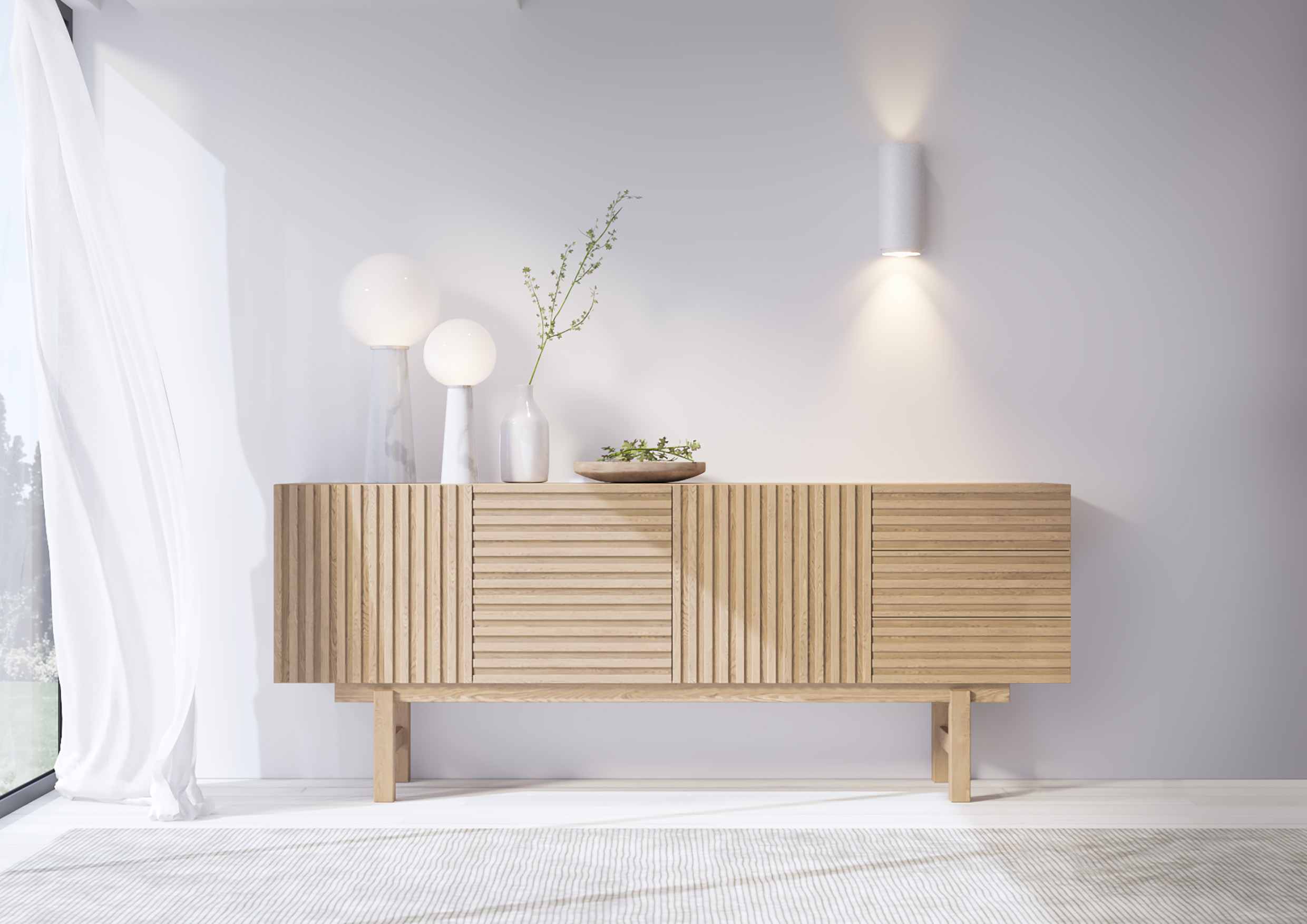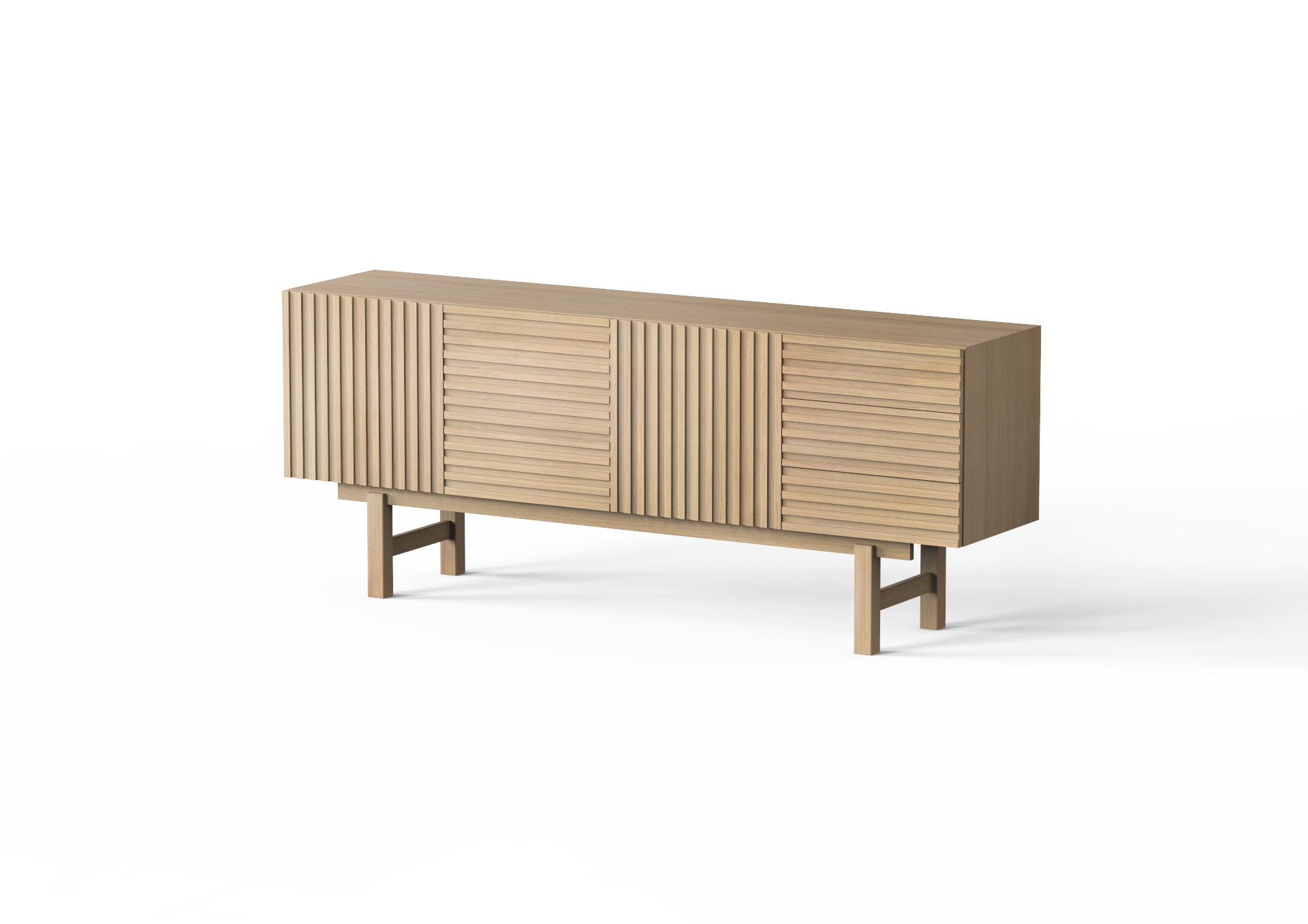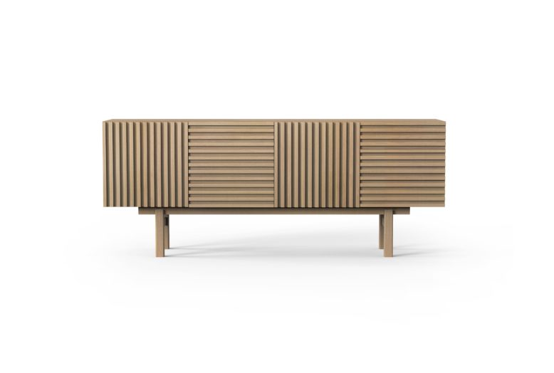 Aparador em contraplacado marítimo folheado a madeira com ripas intercaladas.