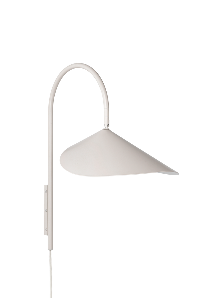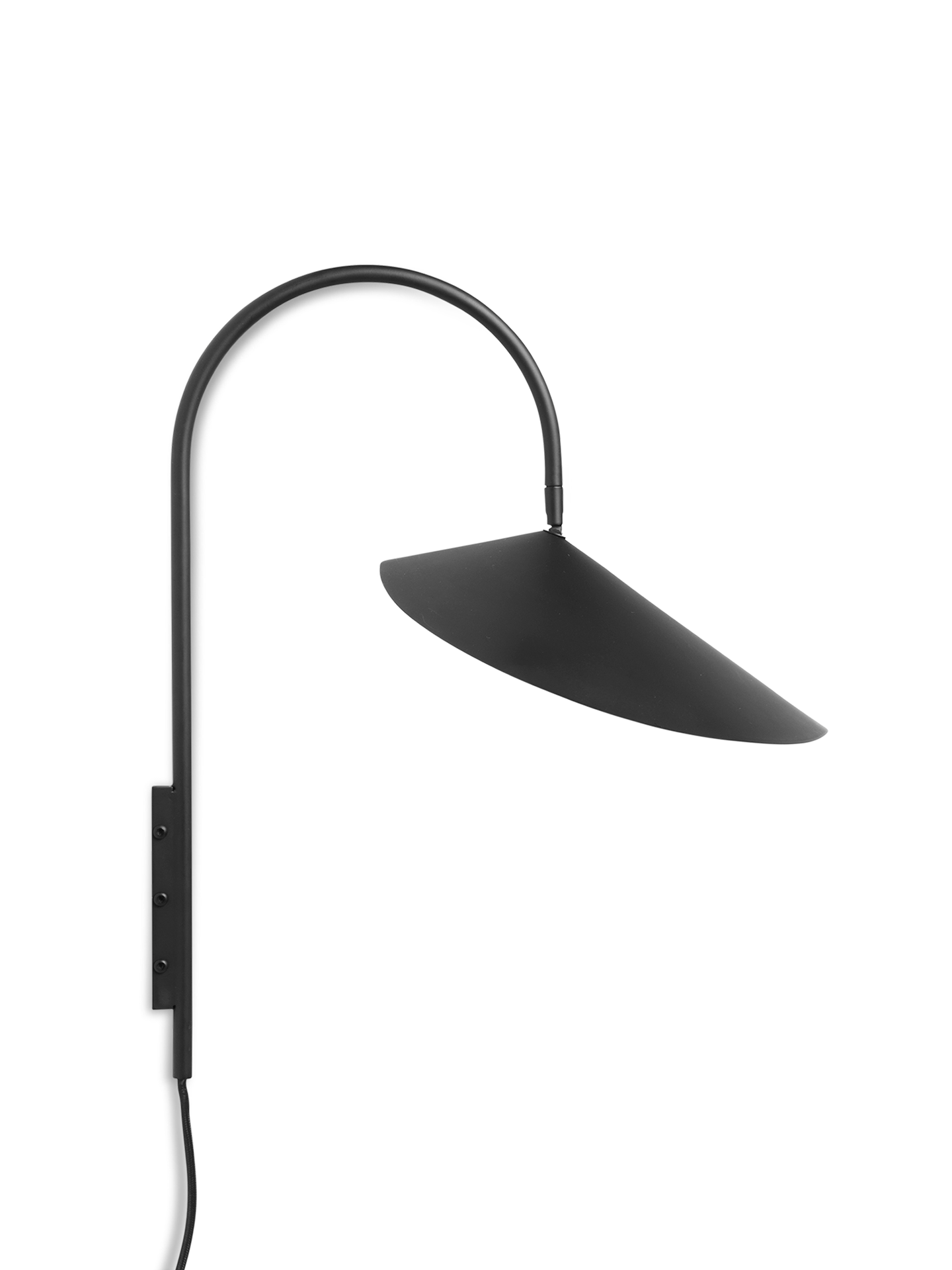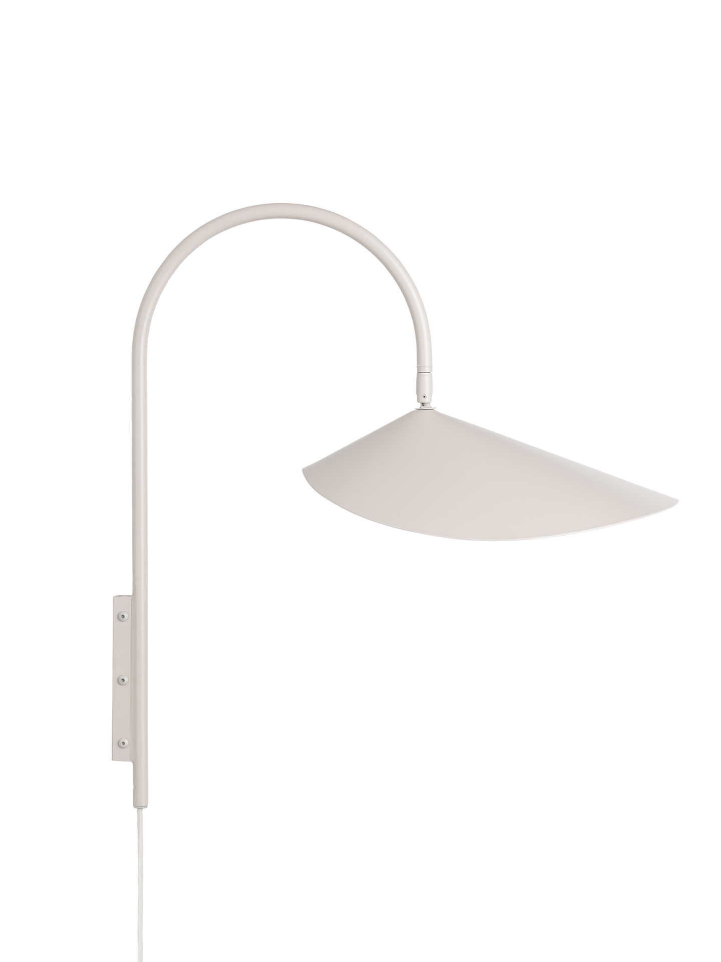 O aplique de parede Arum é caracterizado pela sombra de forma orgânica suspensa do arco de metal curvo de maneira semelhante a uma folha. Com o interior fosco e esbranquiçado do abajur, o aplique fornece uma luz suave e uniformemente distribuída, e o abajur pode ser ajustado para garantir condições ideais de luz em todas as situações. O aplique é fornecido com um suporte de parede, por isso é fácil de montar na parede. O aplique também tem um interruptor.