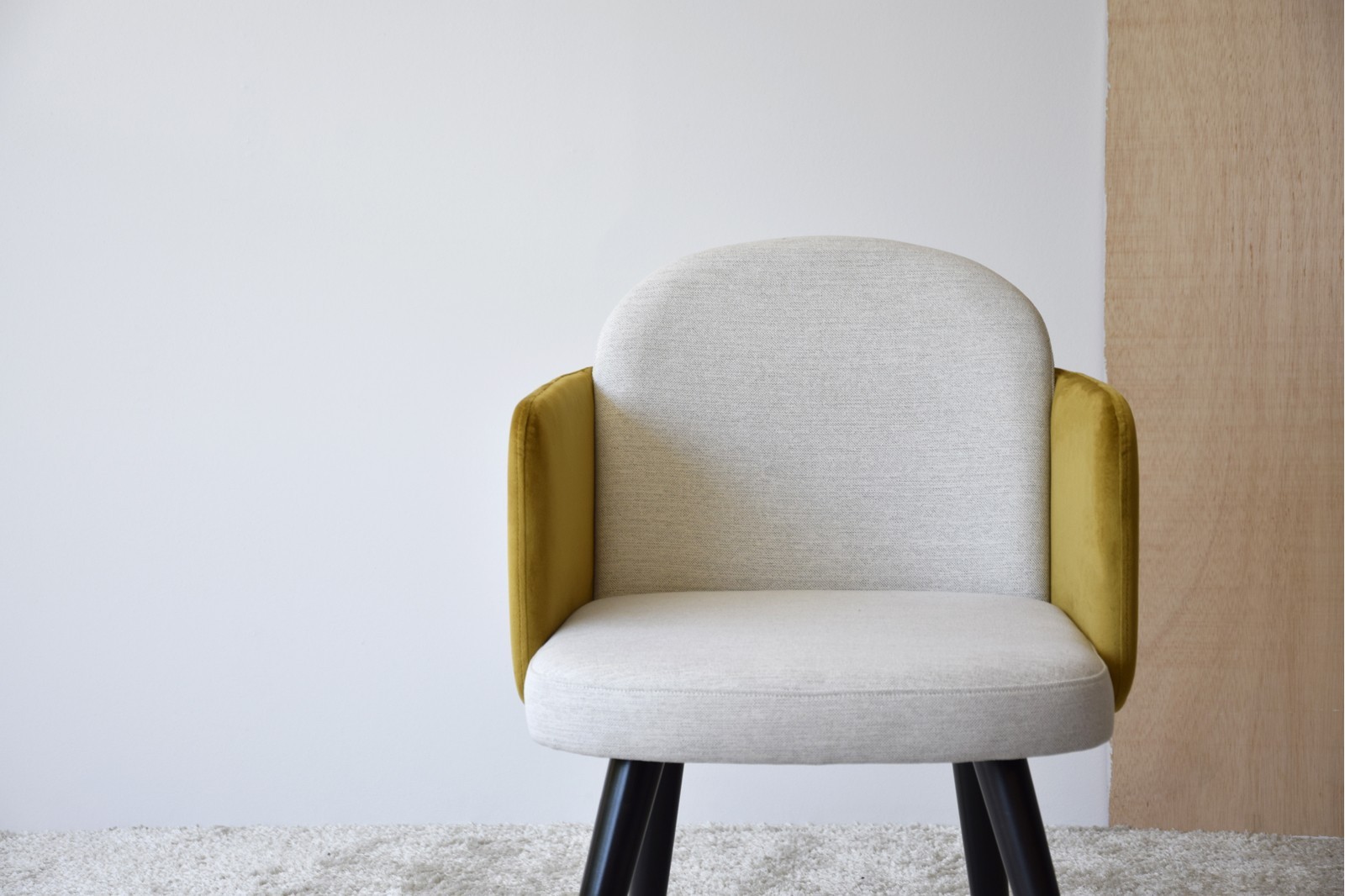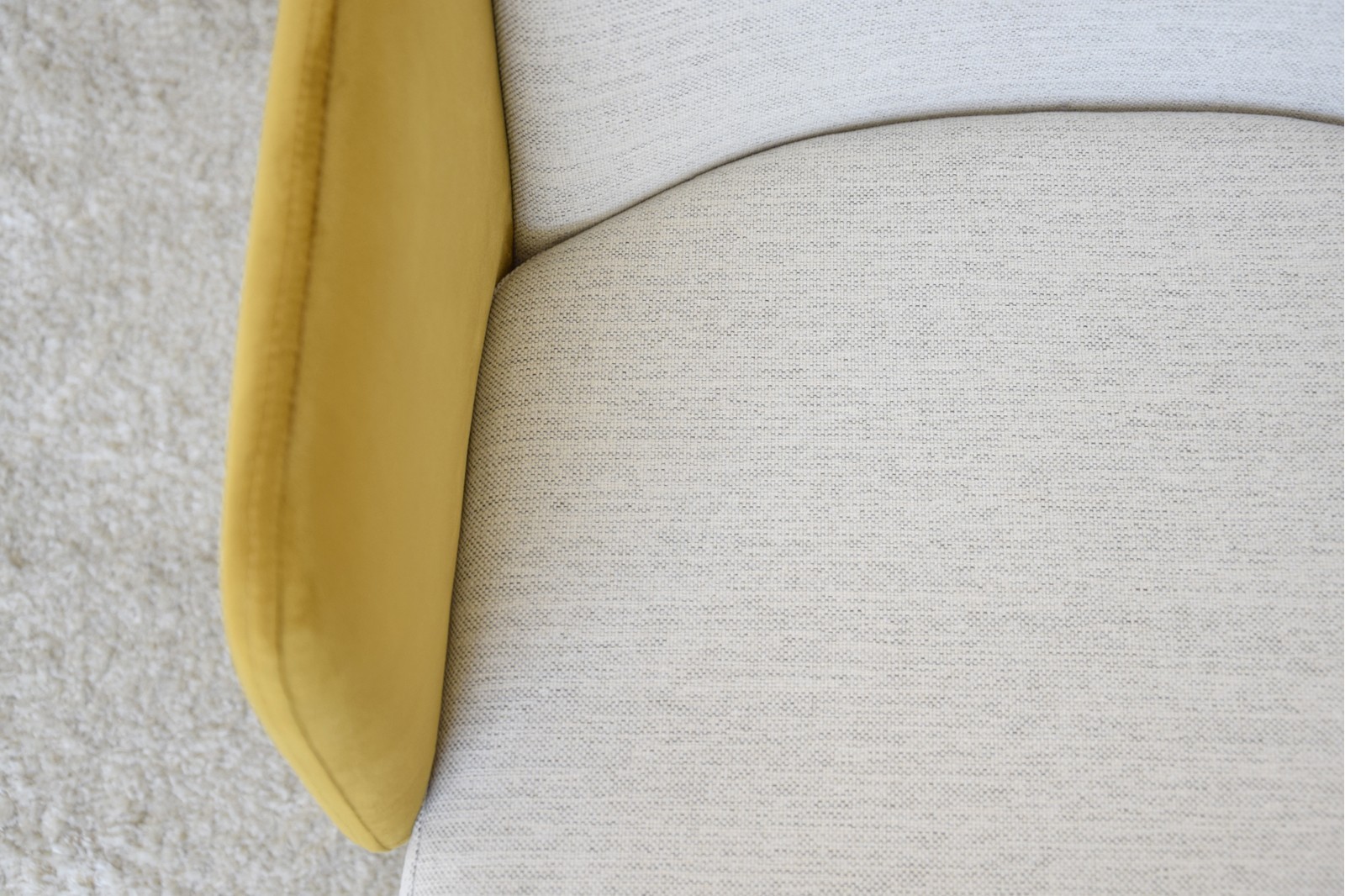 cadeira de jantar com braços em tons cinza e amarelo. estofado em veludo na peça que forma as costas e os braços da cadeira e estofado em tom bege claro no interior. pernas de madeira preta mate com revestimento de metal também na parte inferior em preto mate