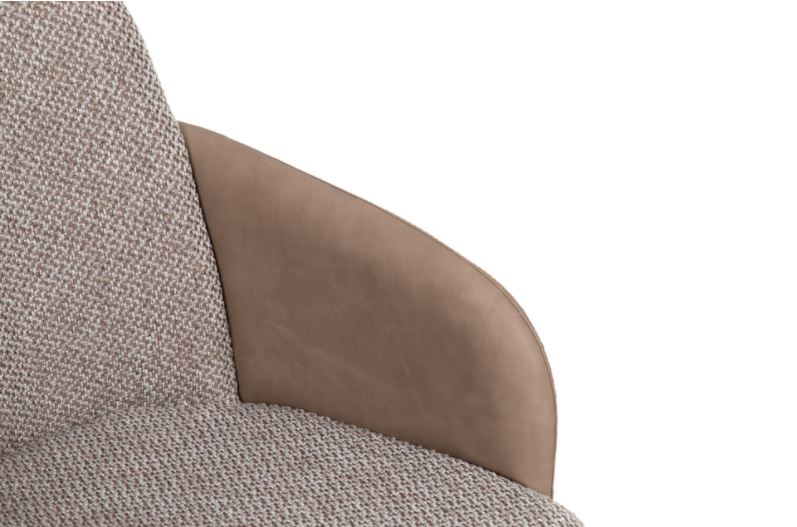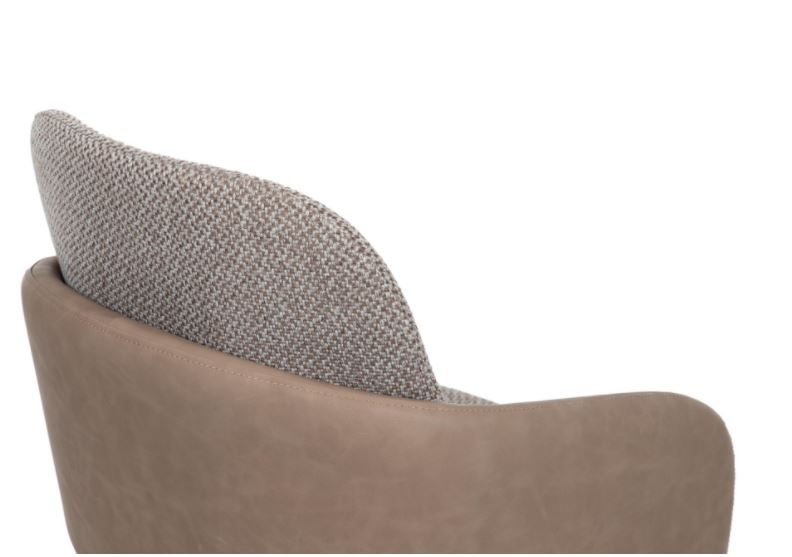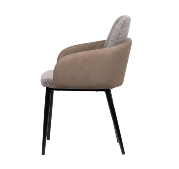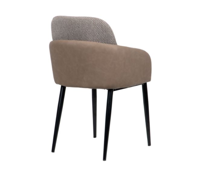 Cadeira com encosto e assento em tecido bege, estrutura em polipele e pés em metal preto.