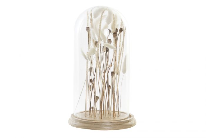 Peça decorativa em vidro e madeira com flores naturais preservadas.