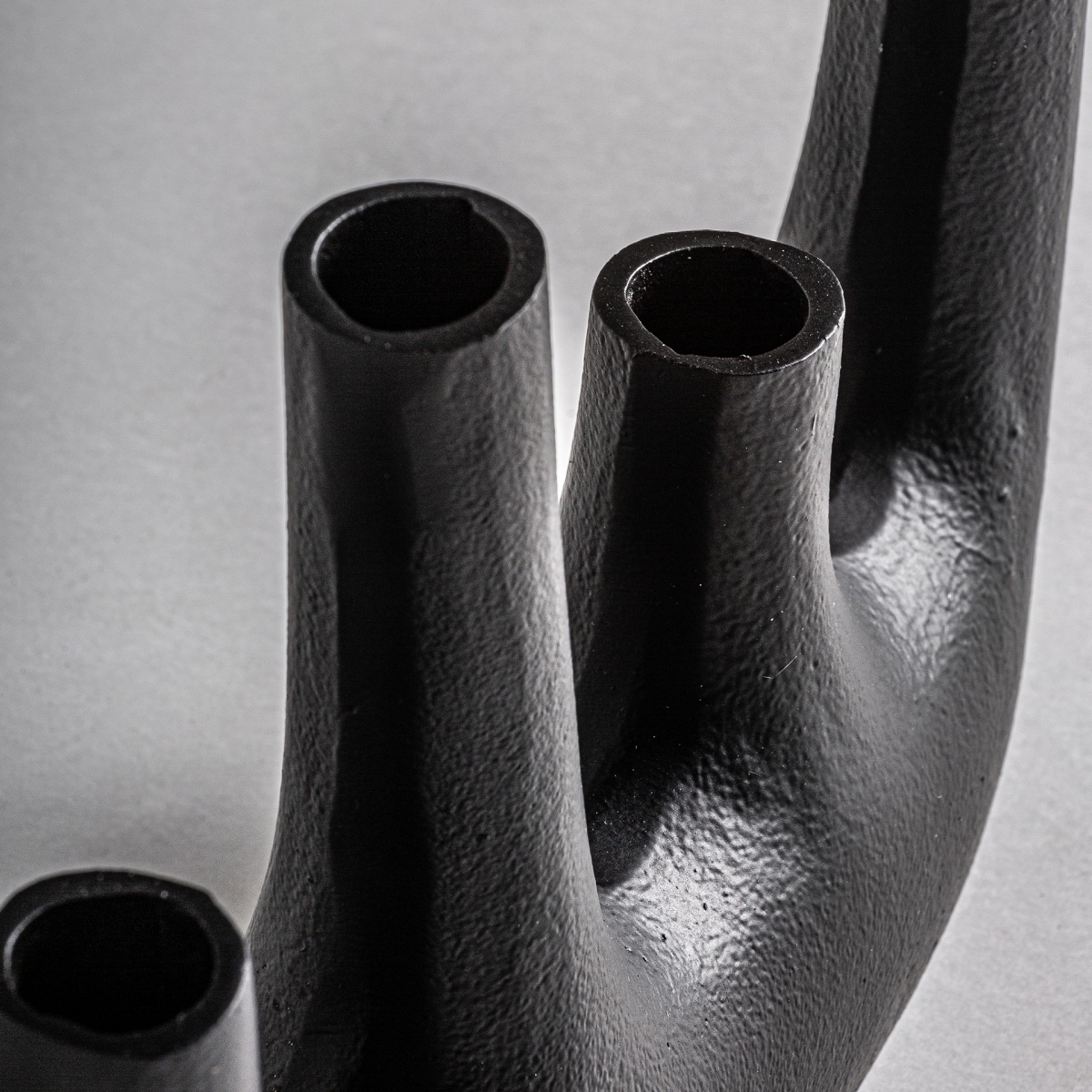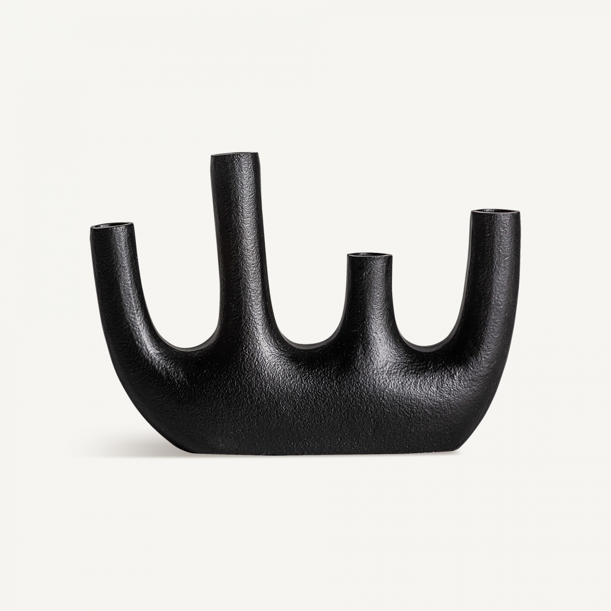 Castiçal de estilo contemporâneo, fabricado em alumínio na cor preta.