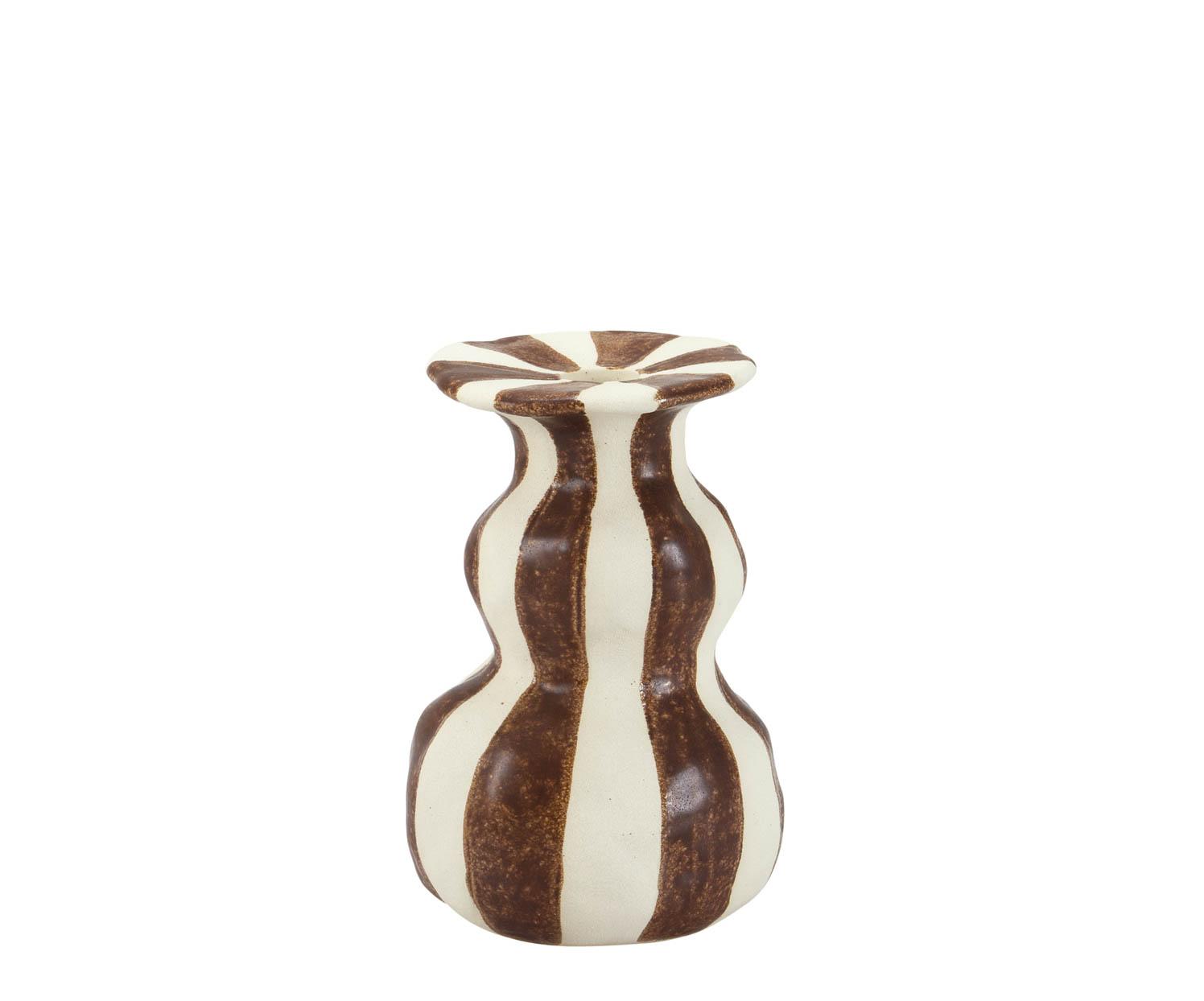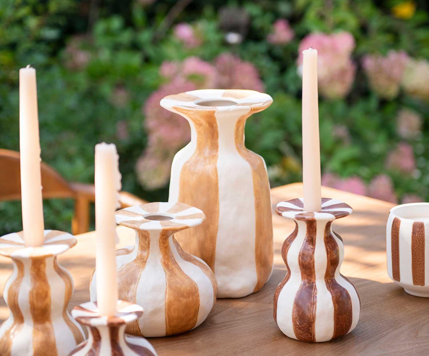 De inspiração artesanal e alma mediterrânica, o Castiçal de Puglia é feito em cerâmica com acabamento manual e um padrão de riscas verticais em terracota sobre branco mate. A sua forma ondulada e expressiva confere elegância e carácter à decoração.