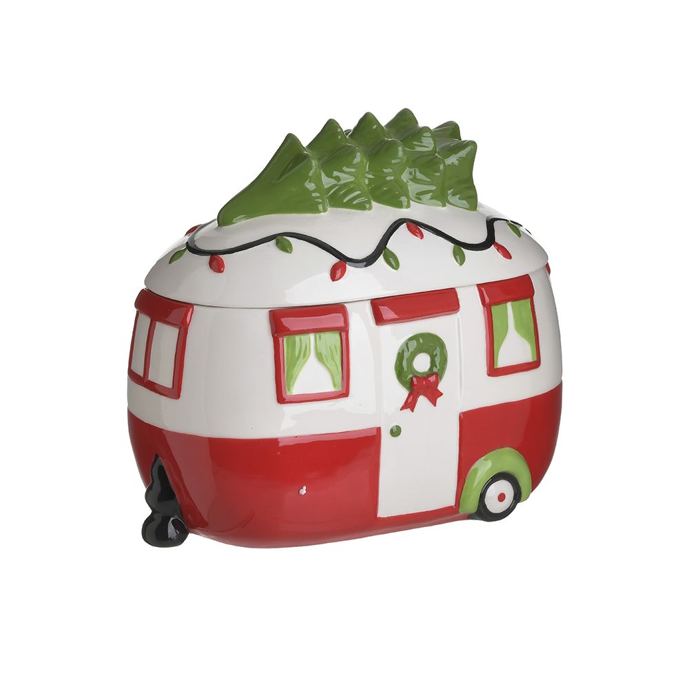 Bomboneira em ceramica em forma de autocaravana com tons vermelho, branco e verde.