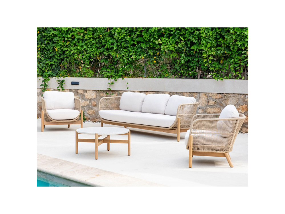 Inclui: Sofá de três lugares, duas poltronas individuais e mesa de centro.