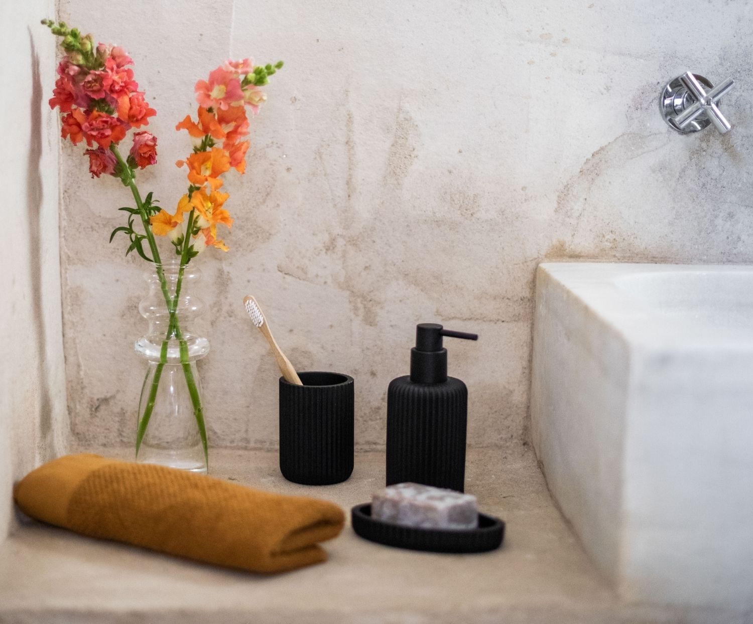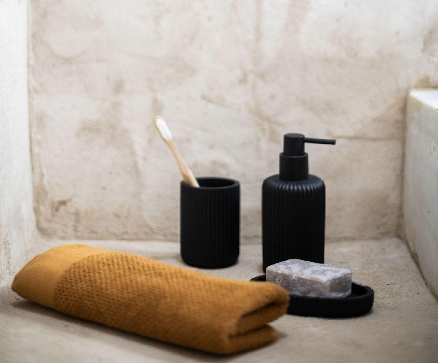 Dispensador de poliresina de color preto. Tem um relevo estriado. O dosseador é em plástico.