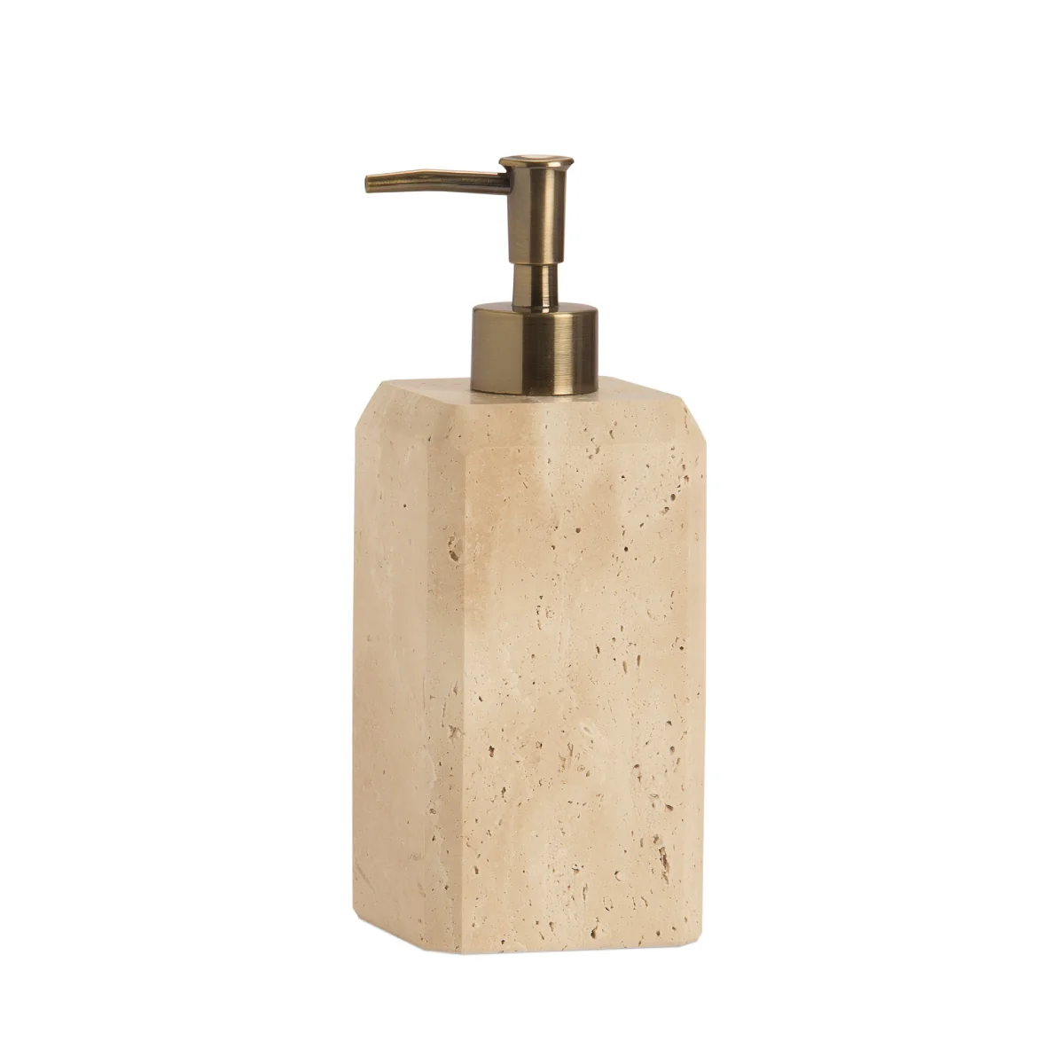 Este doseador de sabonete líquido em mármore travertino combina funcionalidade e sofisticação em um elegante acessório para banheiro. Com design moderno e acabamento polido, este doseador se destaca pela beleza natural e durabilidade do mármore.