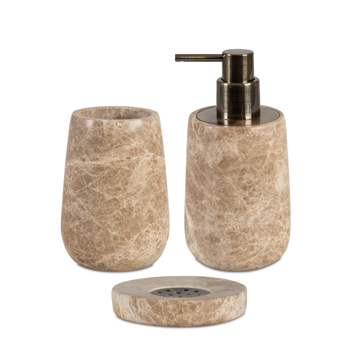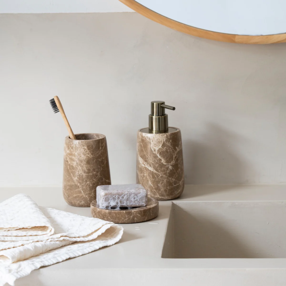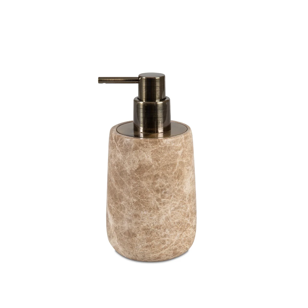 O doseador de sabonete em mármore, com tons quentes de marrom e branco, eleva a decoração e a funcionalidade do seu banheiro. Sua estrutura robusta e acabamento polido adicionam um toque de distinção ao seu banheiro. É ideal para dispensar sabonete com eficiência, com capacidade de 150 ml. Ele também possui uma bomba de metal banhada a ouro para um toque de estilo.