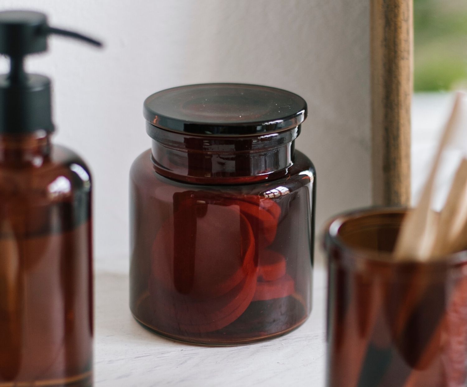 Este frasco de vidro âmbar com tampa tem um ar retro leve estilo boticário.