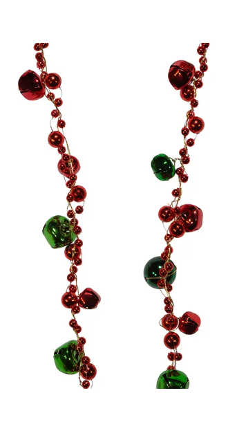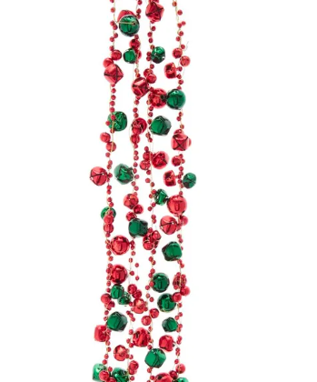 Grinalda com guizos em metal vermelhos e verdes. Esta peça é uma adição divertida e festiva à sua decoração de Natal ou árvore de Natal. Cada sino vermelho e verde é separado por contas vermelhas menores num fio dourado.