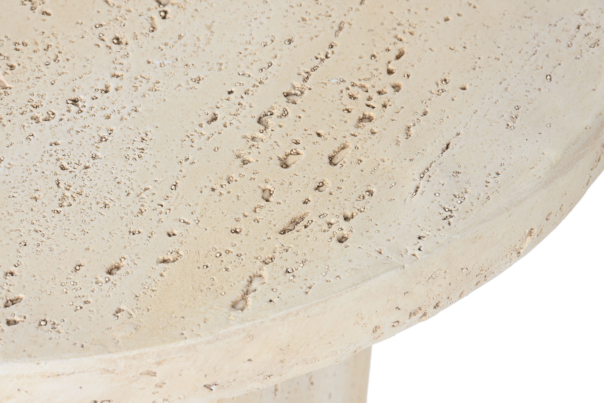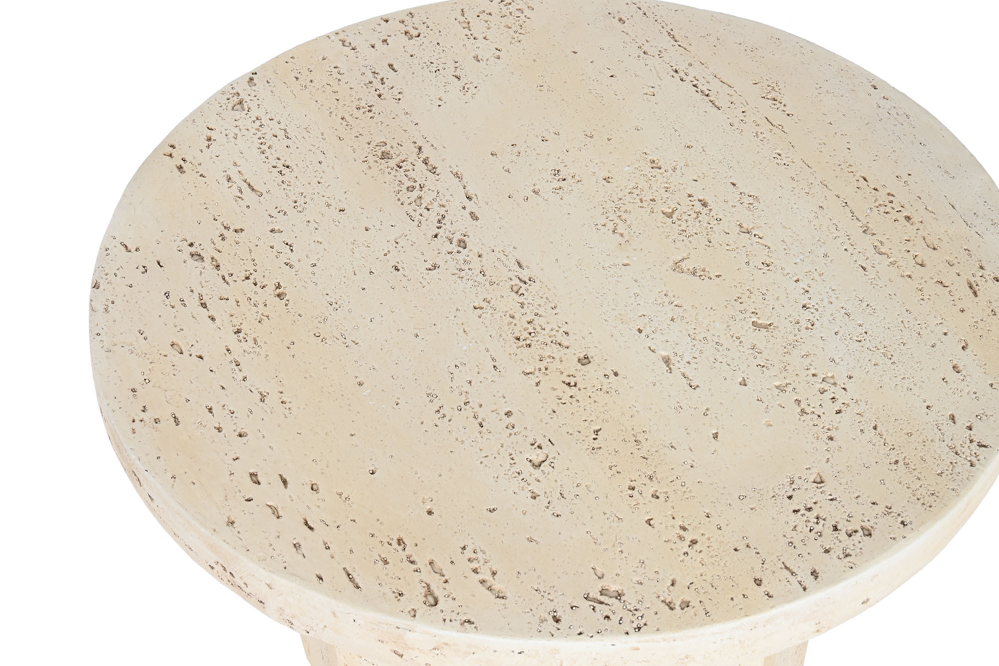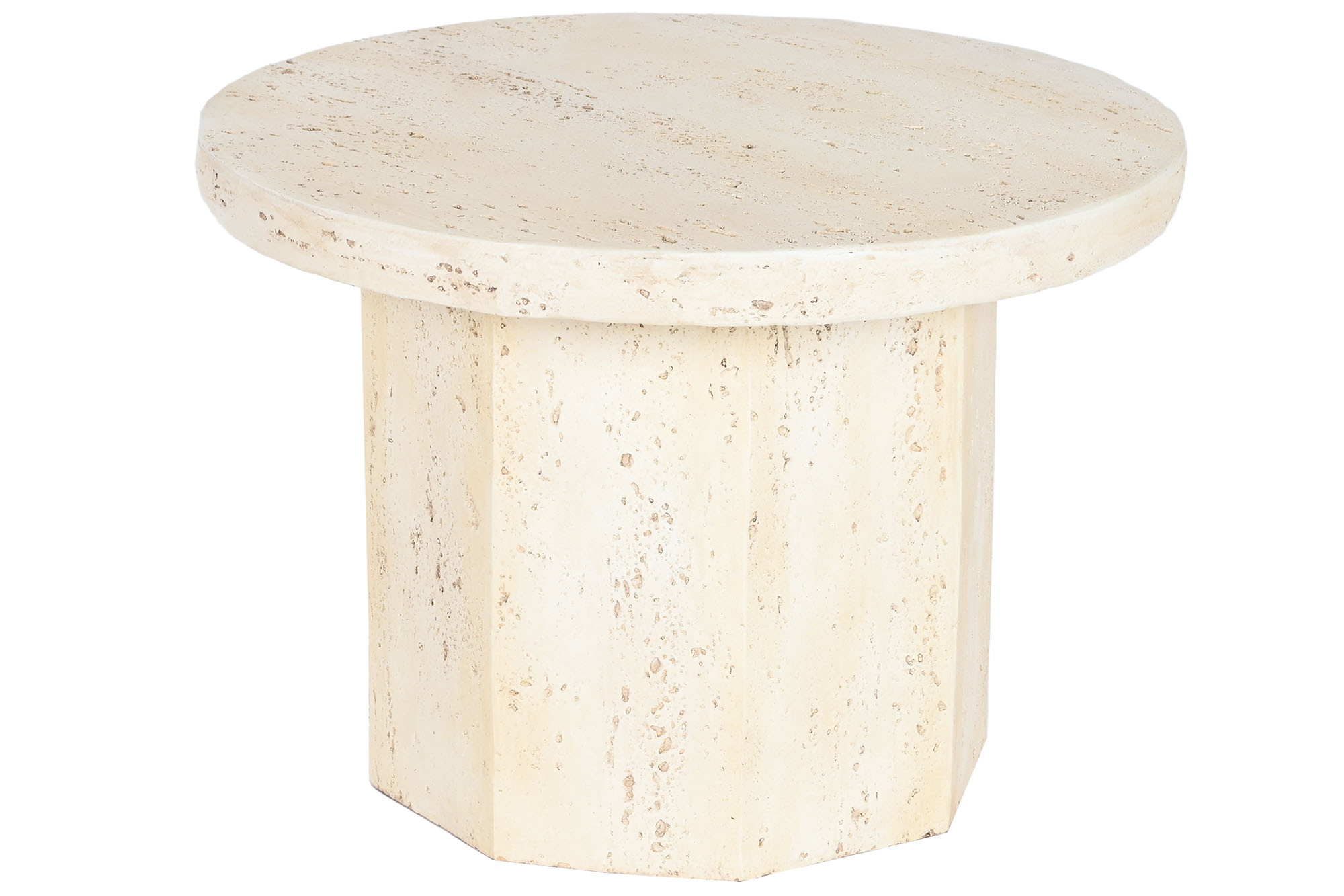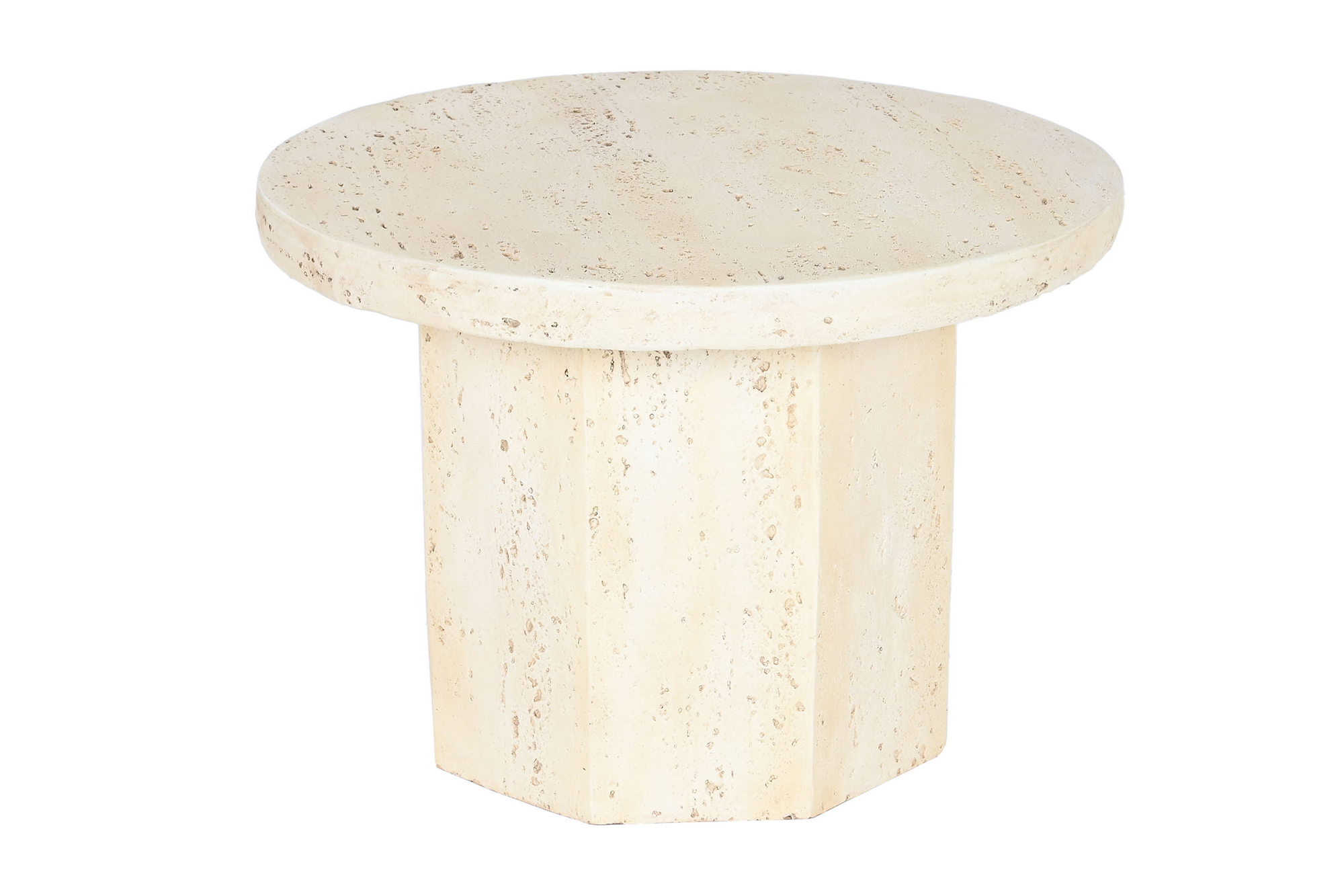 Mesa auxiliar em magnezia, semelhável à marmore, em forma redonda.
