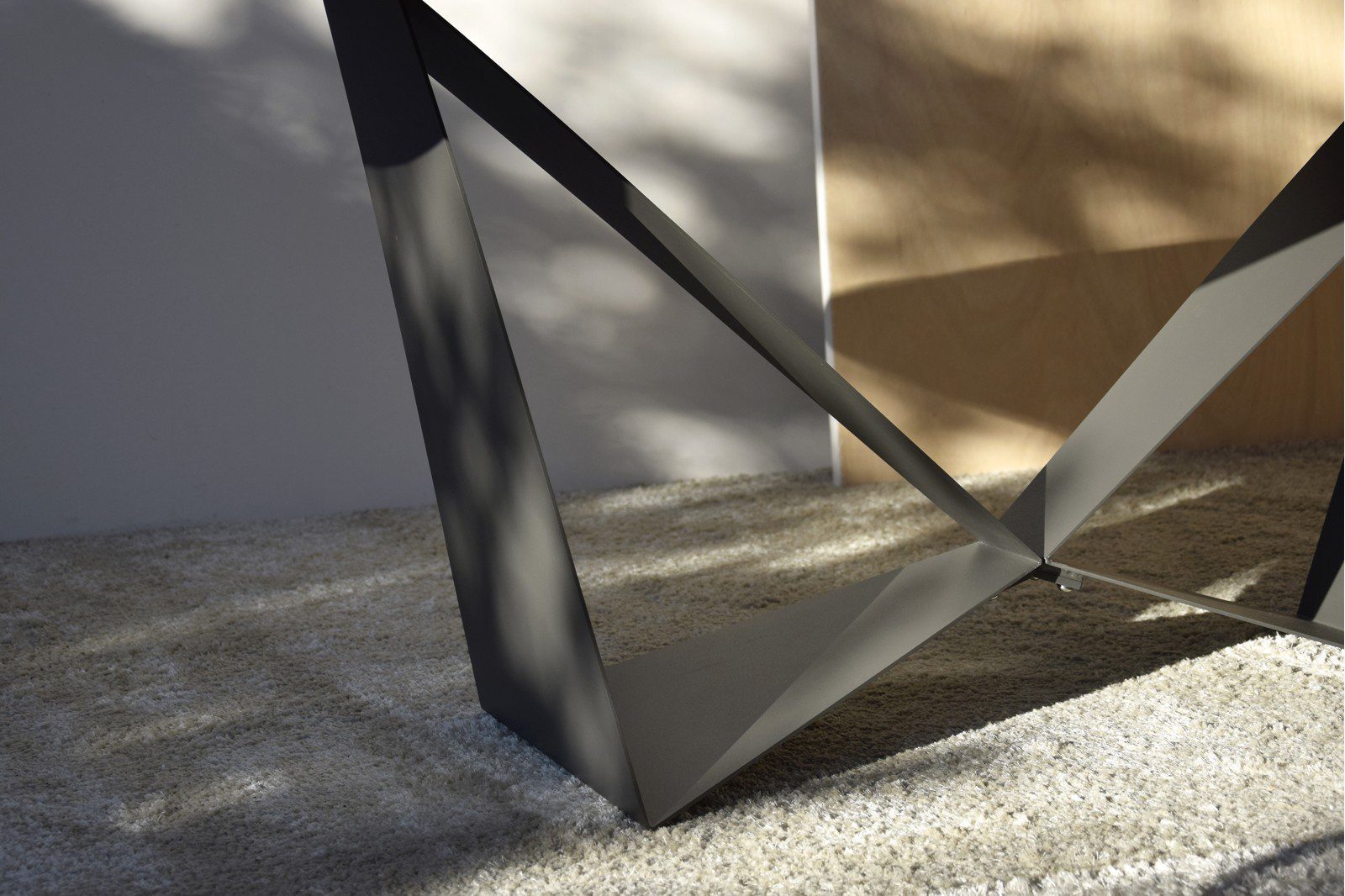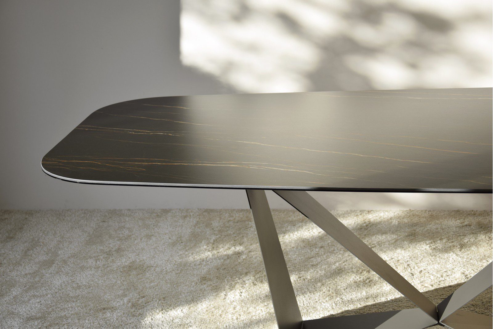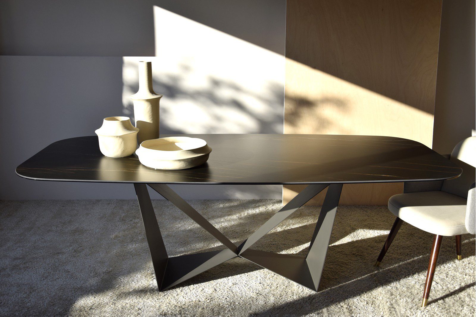 Mesa de jantar com suporte feito de 6 mm de material de cerâmica em preto com acabamento de tom vintage de ouro montado em base de vidro temperado de 8 mm forma retangular com cantos arredondados. base em metal acabado em grafite.