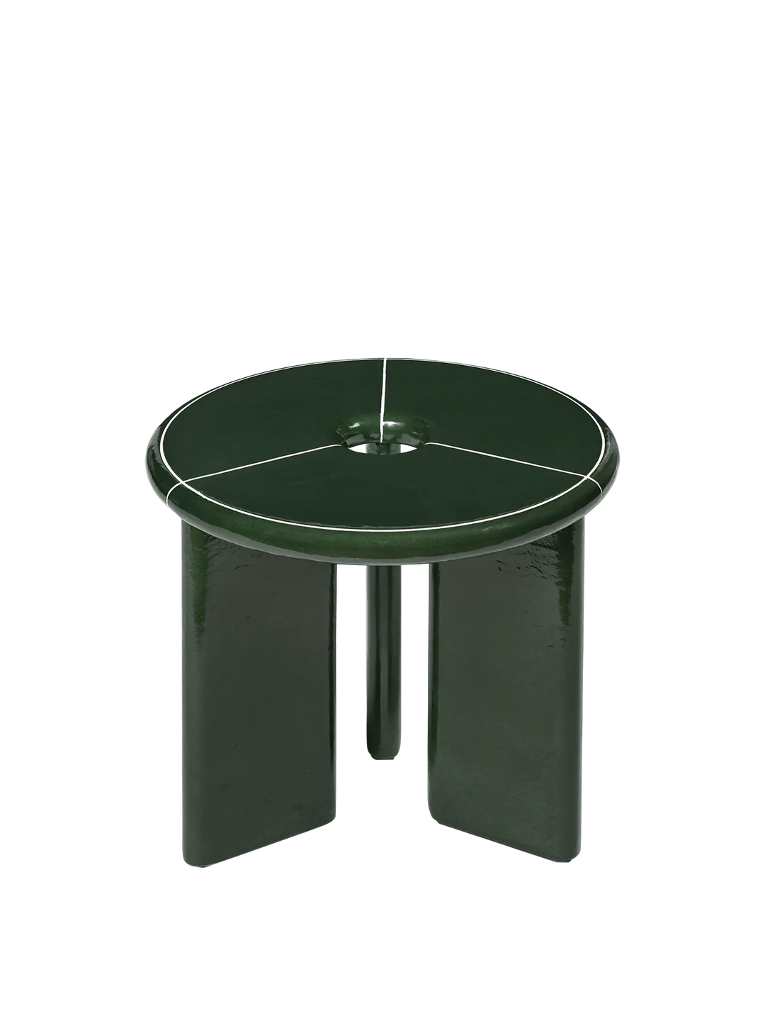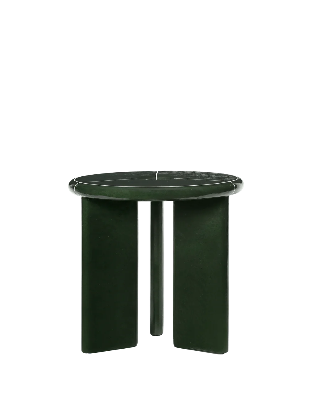 Feita em concreto fibroso, a Mesa Lateral Deya apresenta um impressionante esmalte verde-escuro com textura irregular, acentuado por linhas de rejunte em tom off-white. O tampo segmentado apresenta um apelo geométrico arrojado, complementado por bordas generosamente arredondadas para uma presença suave. Equilibrando o artesanato artesanal com uma geometria arrojada, a Mesa Lateral Deya é uma peça versátil, adequada tanto para espaços internos quanto externos.