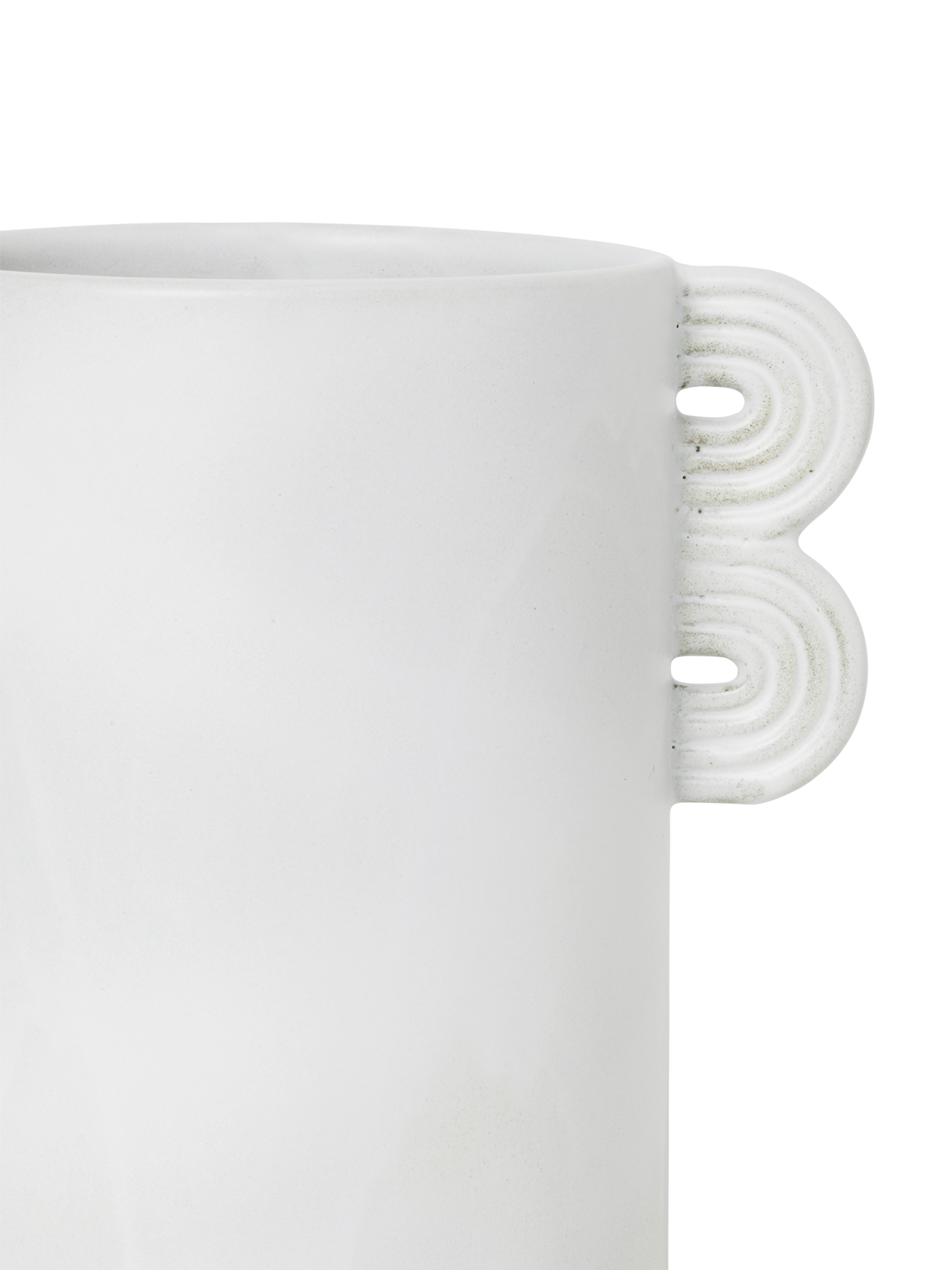 Os vasos são feitos de cerâmica vitrificada com uma expressão áspera para complementar os sulcos refinados da forma. Com uma expressão atemporal, mas contemporânea, eles vão fundir o futuro com uma espécie de memória do passado.