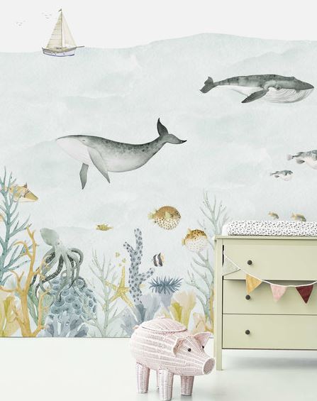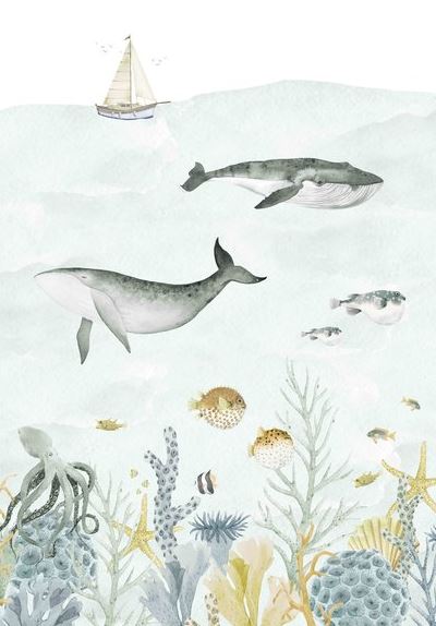 Papel de parede personalizado significa que podemos entregar cada design nas medidas exatas da(s) sua(s) parede(s). Ajustamos o design de uma forma que se encaixe perfeitamente. Então, no caso de uma parede inclinada, uma cama/armário contra a parede ou há uma porta/janela/aquecedor? Basta dar-nos todas as informações necessárias e ajustamos o design! Este papel de parede mostrará uma boa visão geral do oceano. Baleias, várias espécies de peixes e corais em um relance.