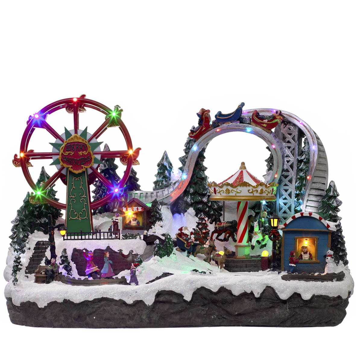 Parque de diversões com roda gigante e carrossel, iluminação e movimento. Com transformador