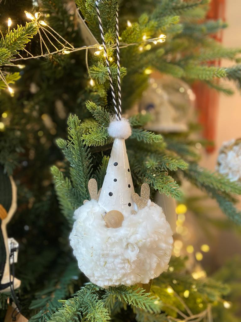 Ornamento em tecido e metal. Em tons brancos, pretos e dourados.
