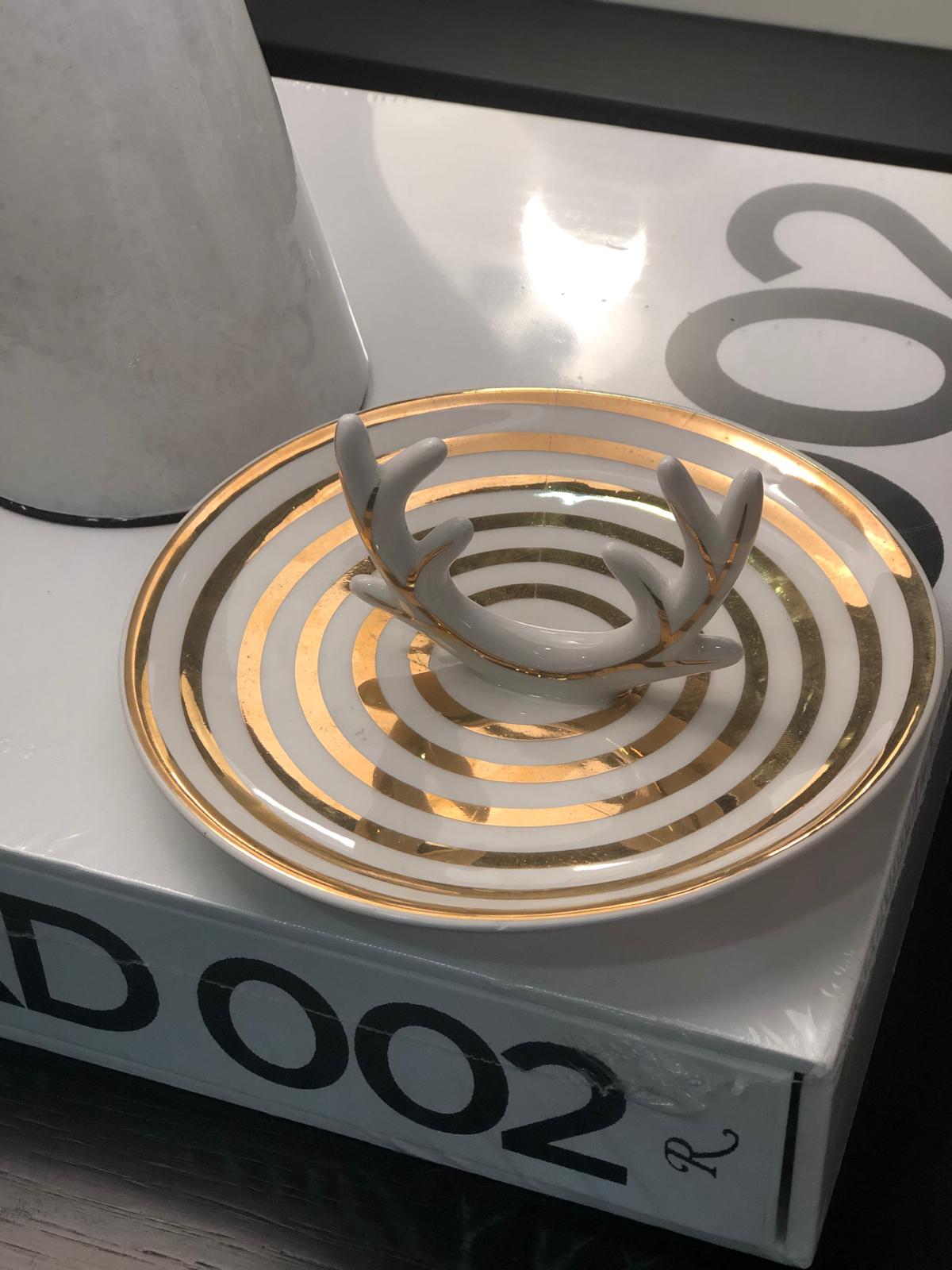 Prato Veado na cor dourada. É utilizado como objeto decorativo.
