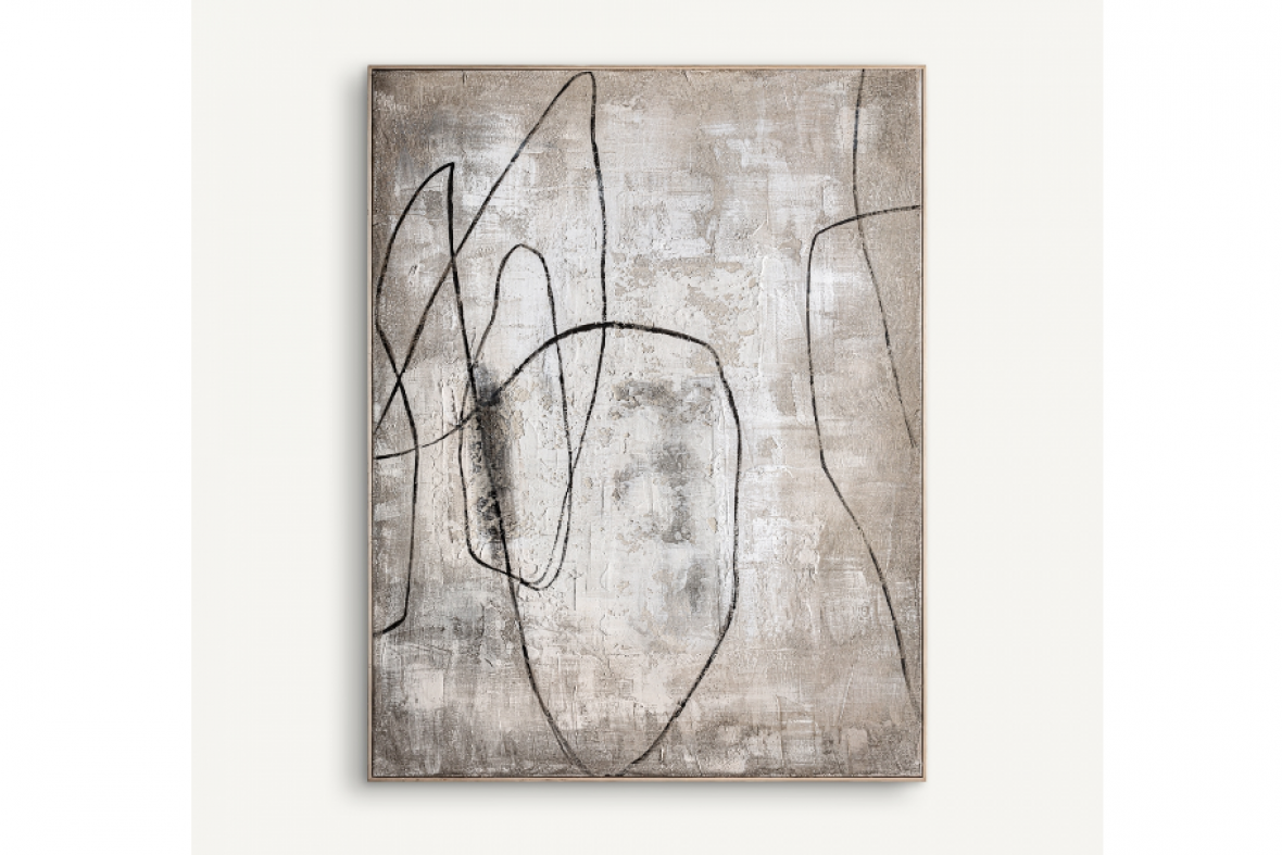 Quadro Enver, estilo contemporâneo. Feito em tela, em tons claros artesanais, combinados com madeira de pinho, na cor marrom claro.