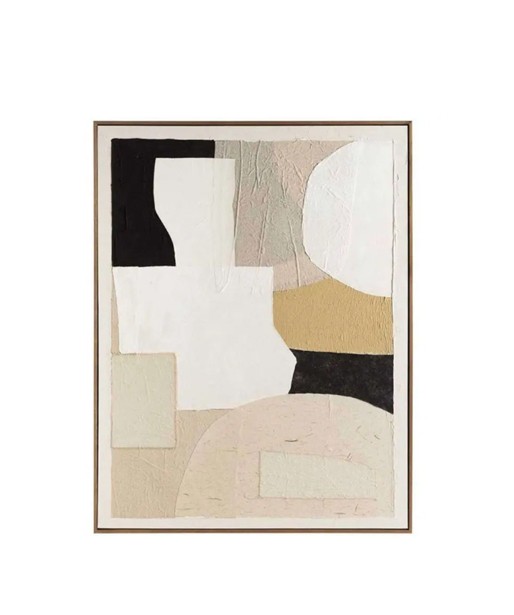 A pintura abstrata contemporânea Miami é uma pintura que evoca a modernidade em cada detalhe. Esta tela apresenta uma sobreposição harmoniosa de retângulos nos tons branco, bege, castanho e preto, criando uma composição visualmente cativante. Esta peça inclui uma elegante moldura de madeira.