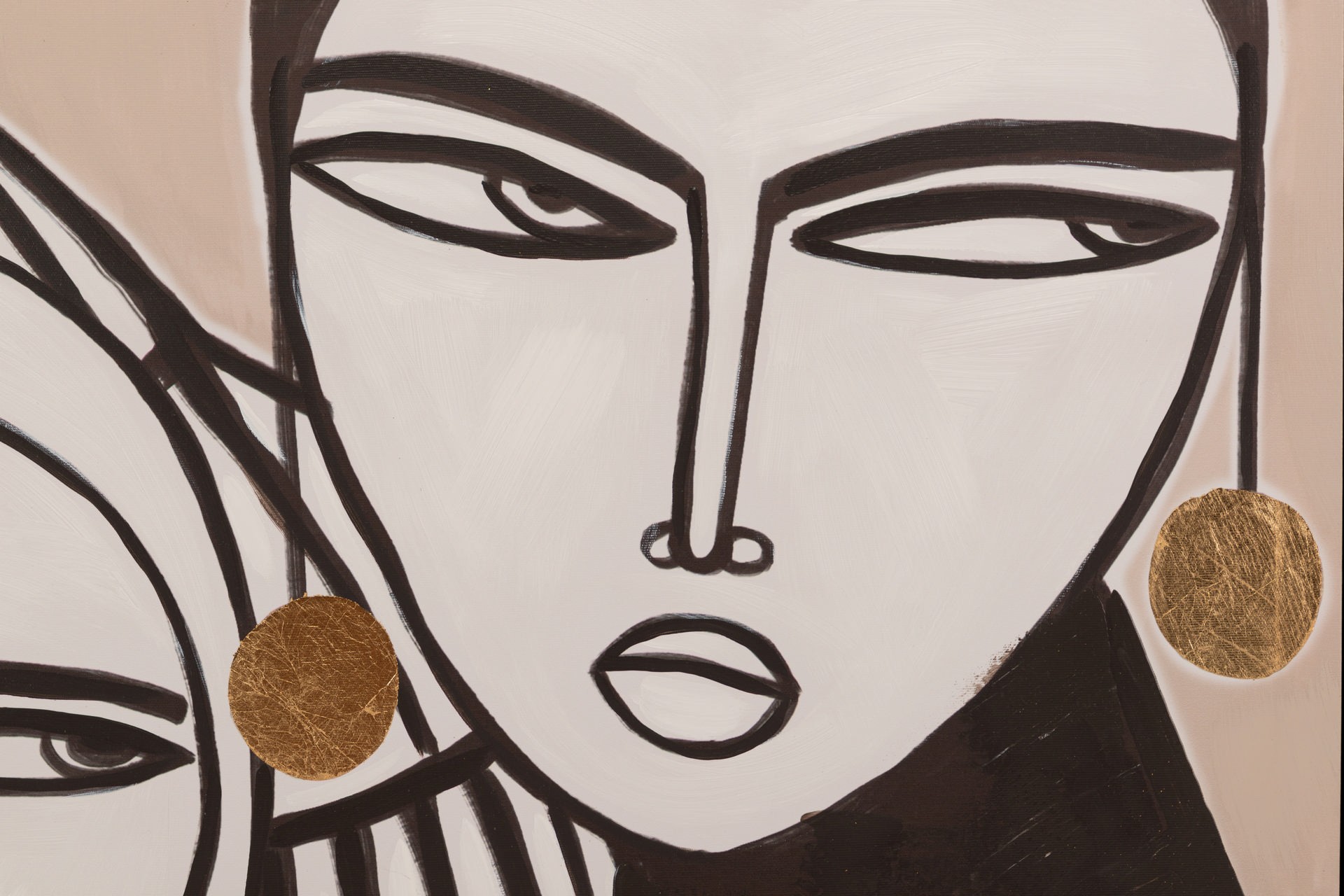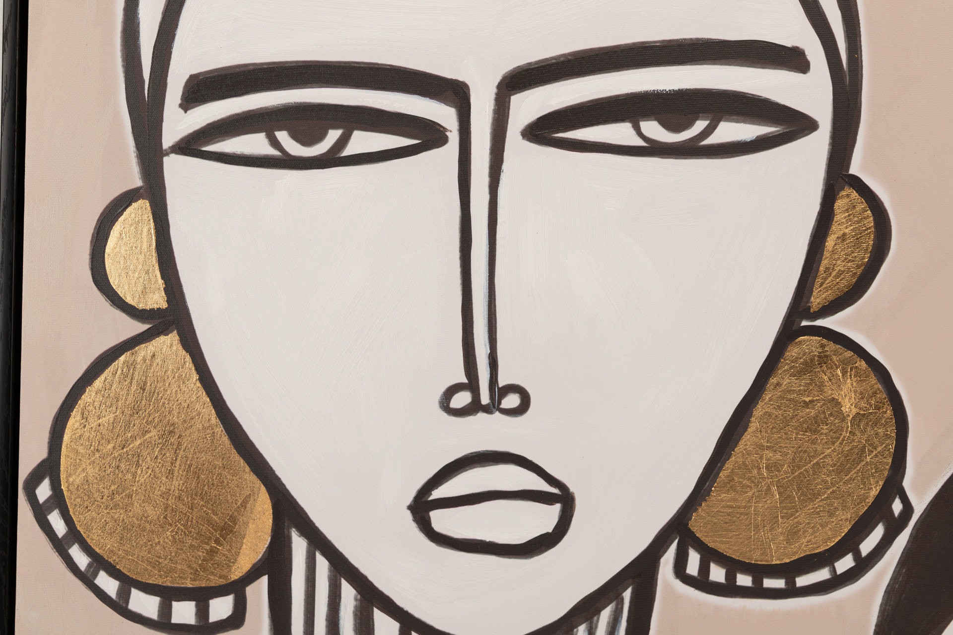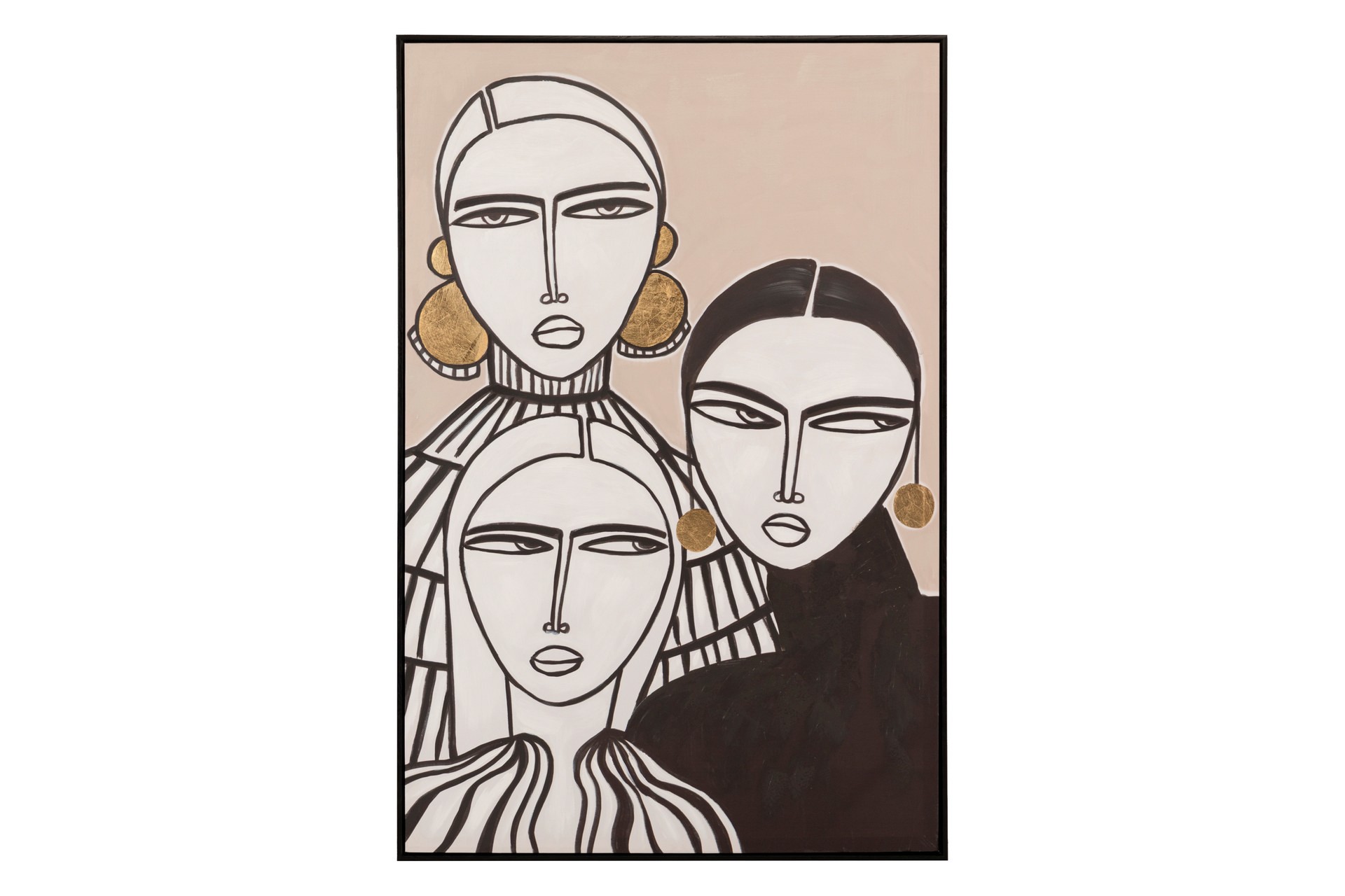 Quadro com desenhos de mulheres em preto e branco e detalhes em dourado. moldura preta.