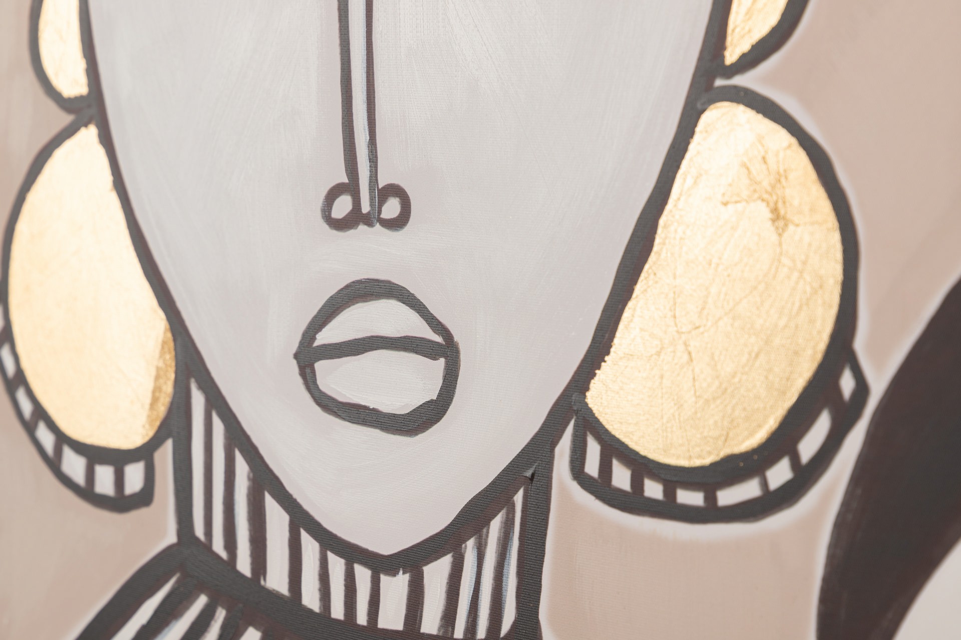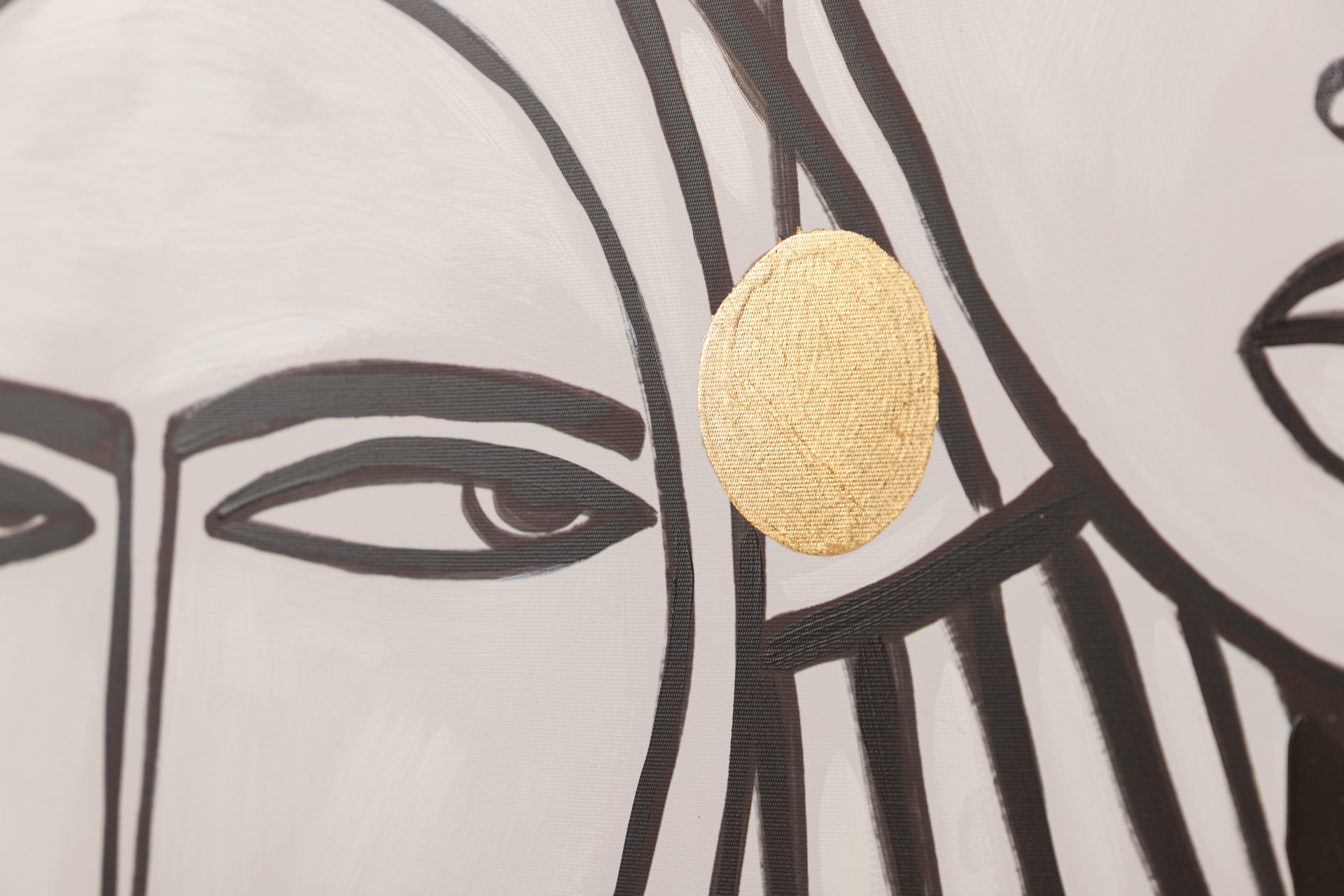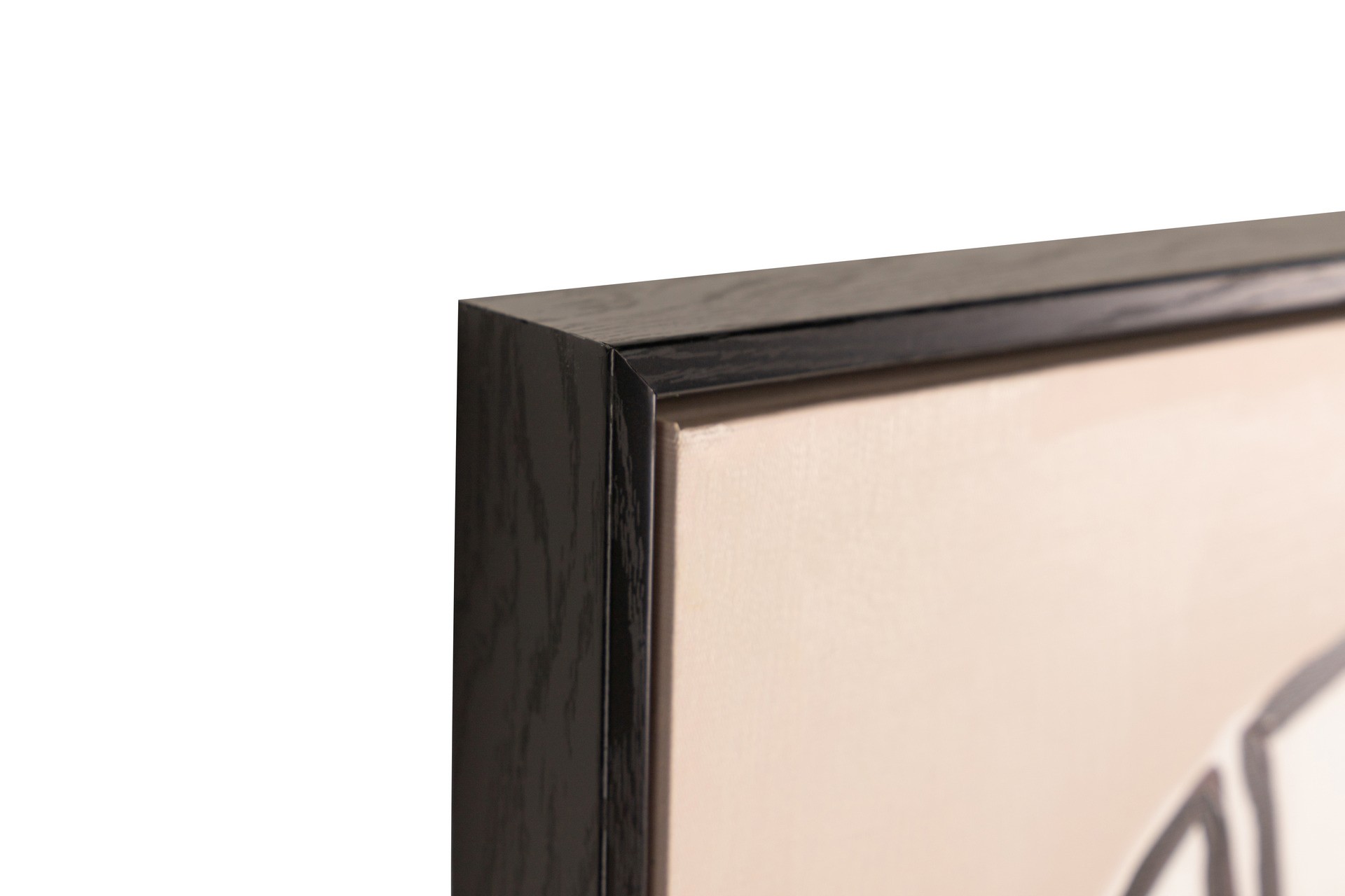 Quadro com desenhos de mulheres em preto e branco e detalhes em dourado. moldura preta.