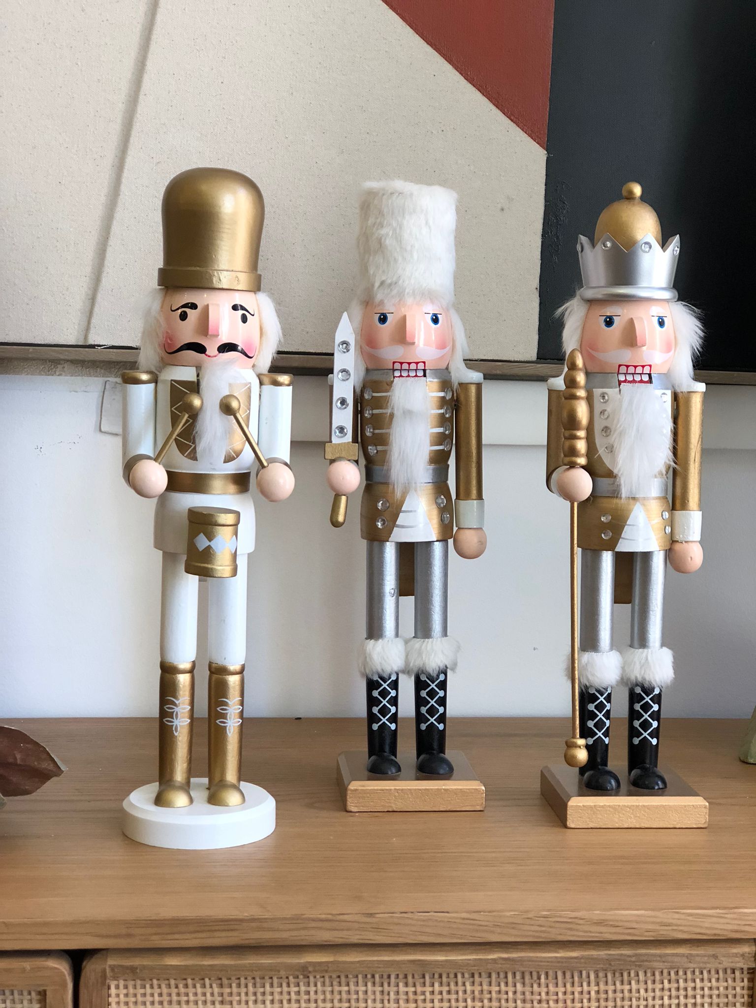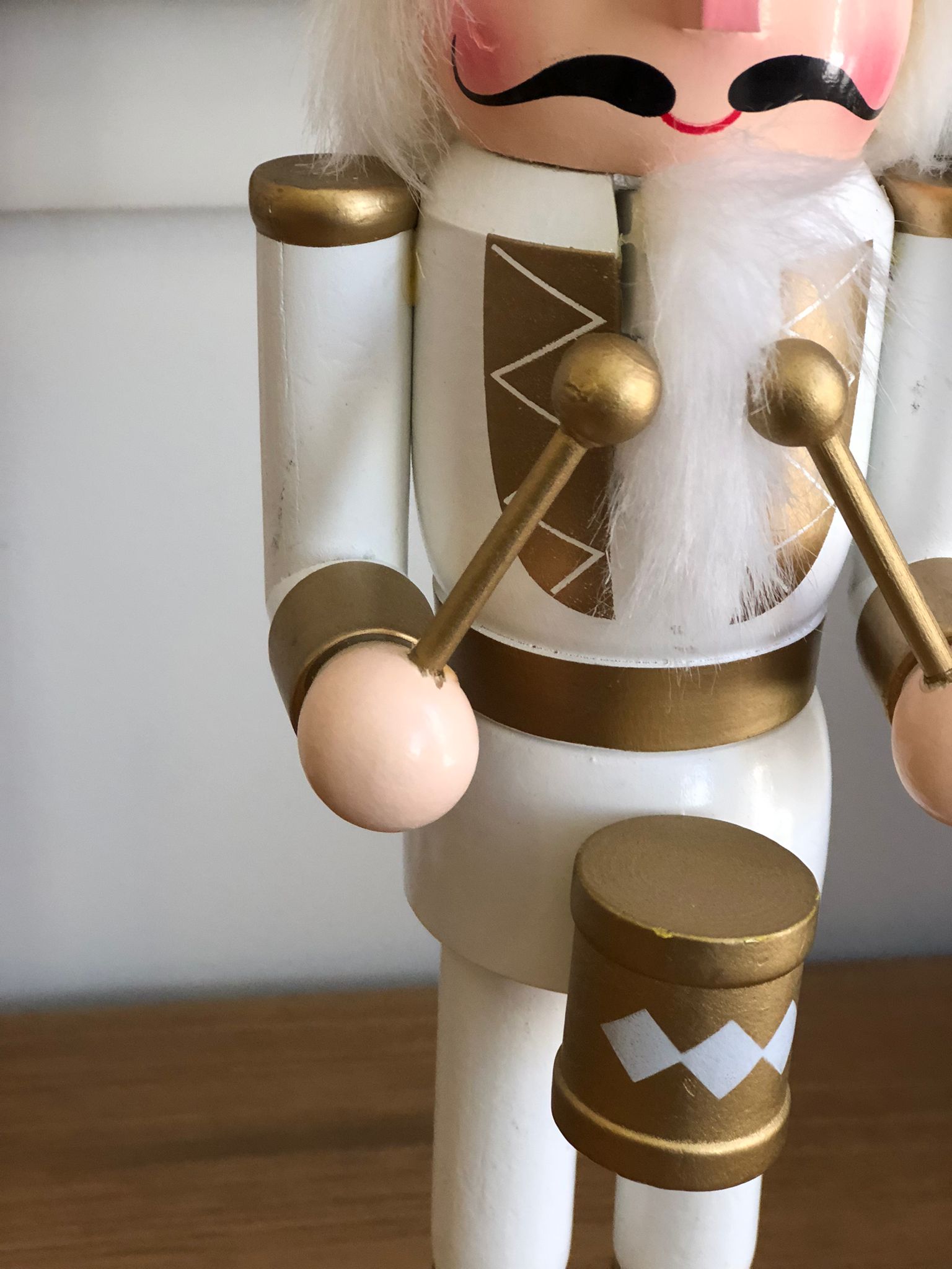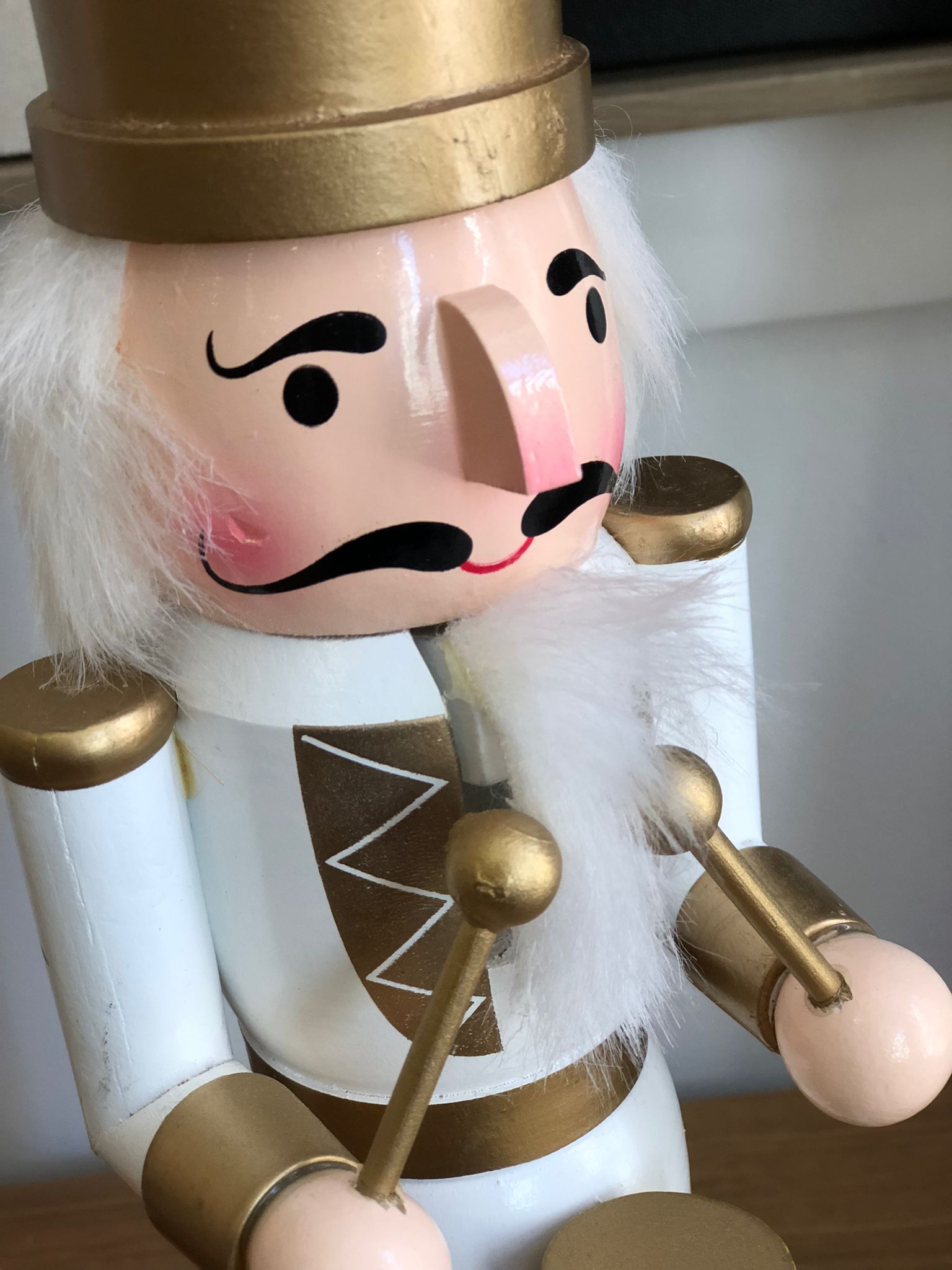 Quebra noz em madeira nos tons dourado, cinza e branco, o enfeito ideal para complementar a decoração de natal.