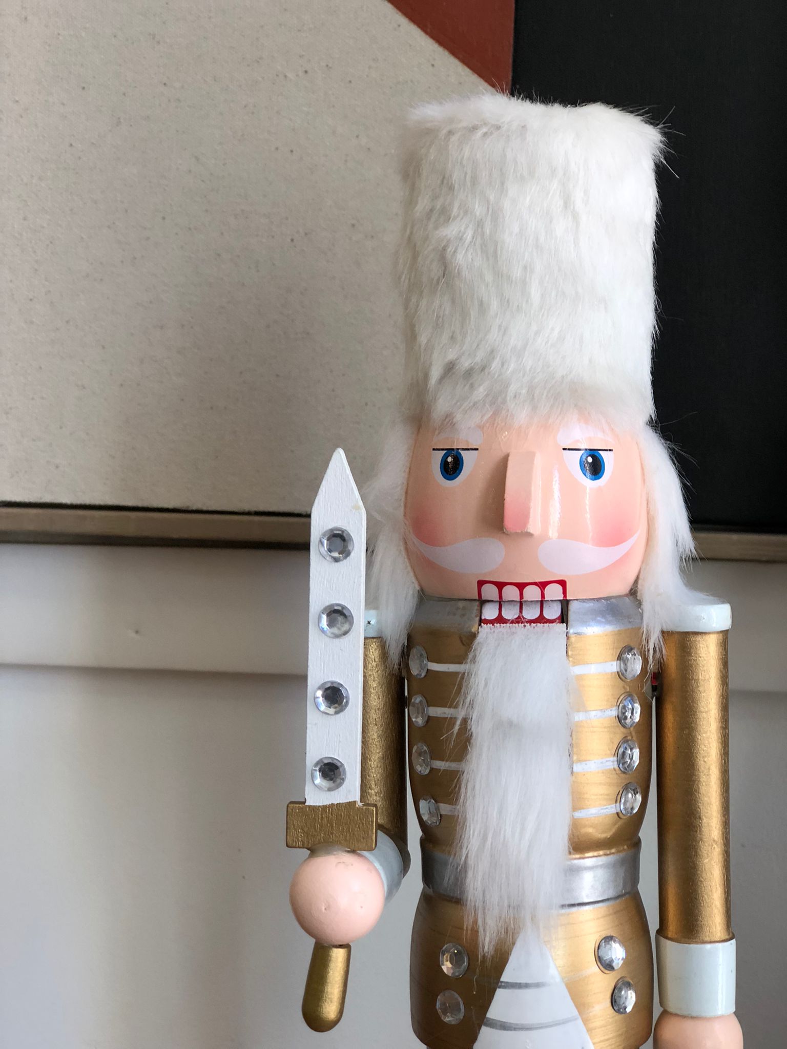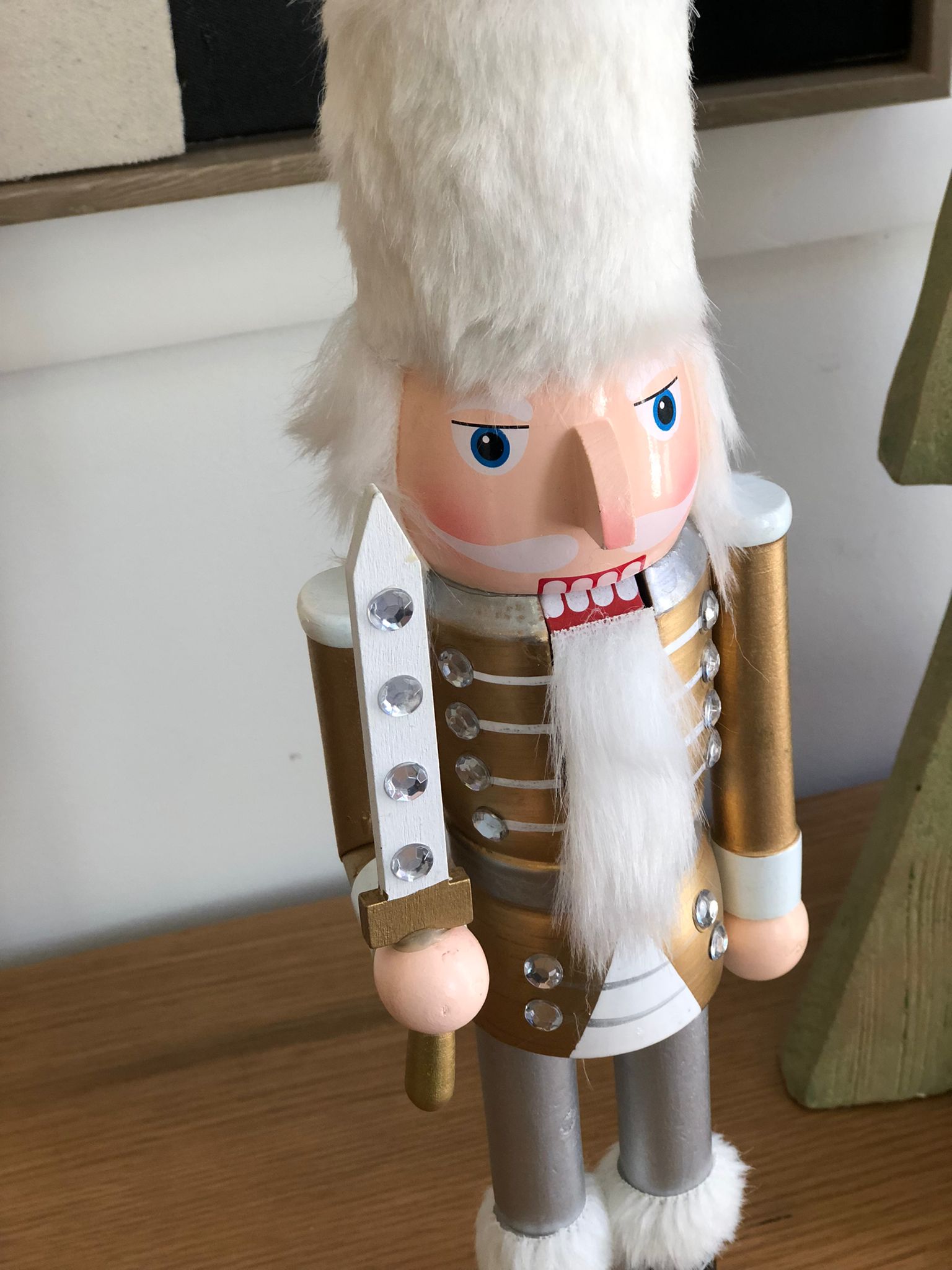 Quebra noz em madeira nos tons dourado, cinza e branco, o enfeito ideal para complementar a decoração de natal.