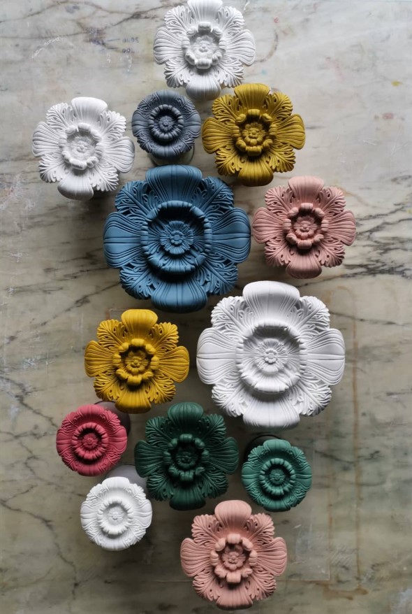 Escultura feita à mão em formato flor em gesso por Iva Viana.