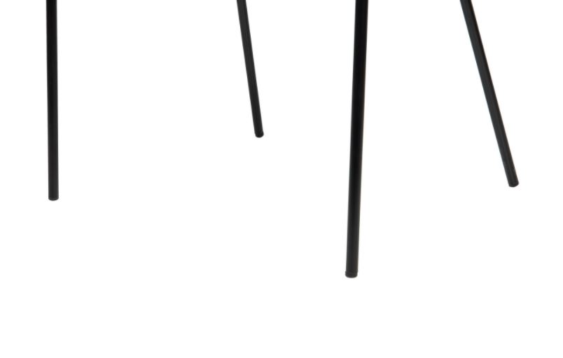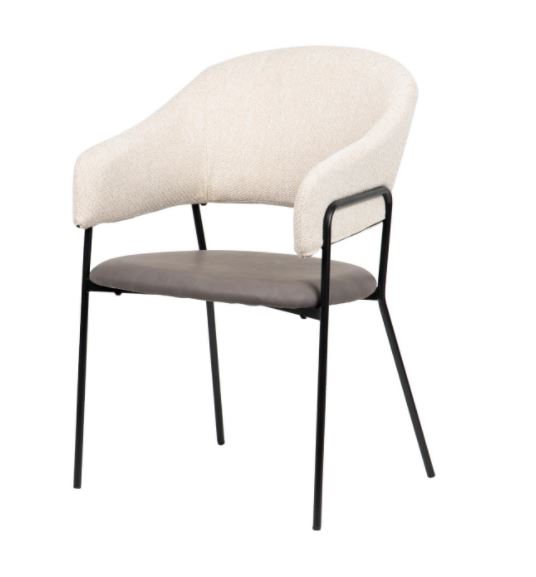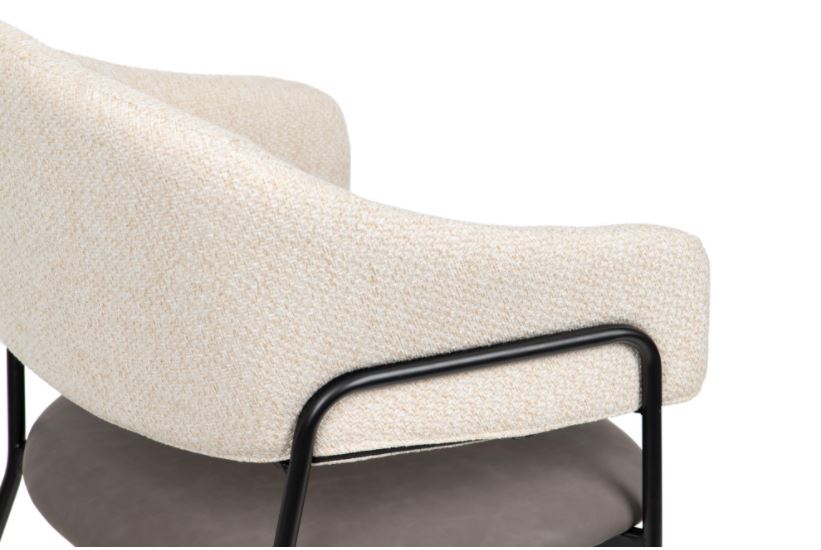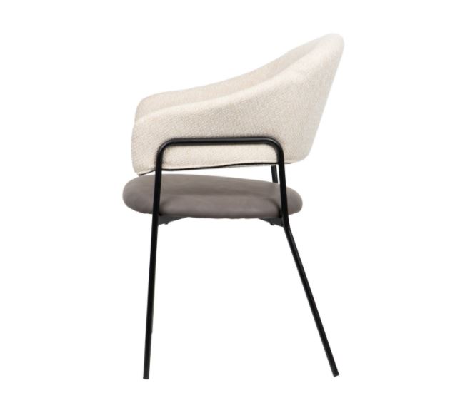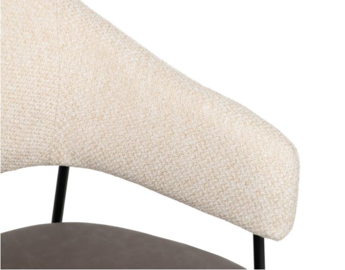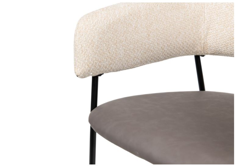 Cadeira com encosto em tecido bege, assento em polipele e pés em metal preto.