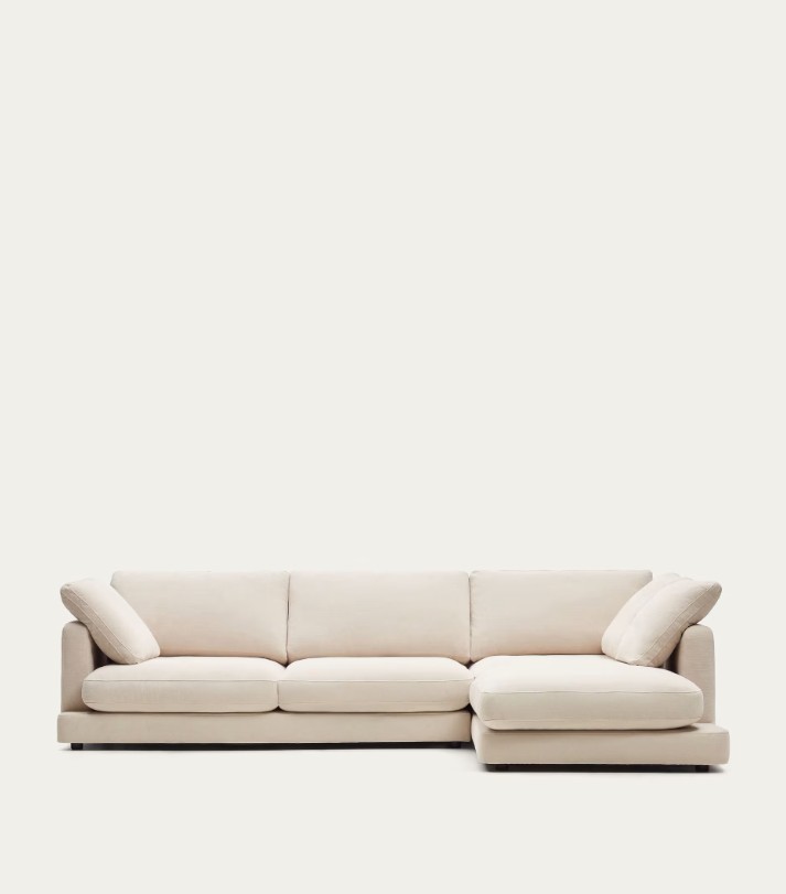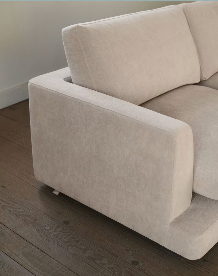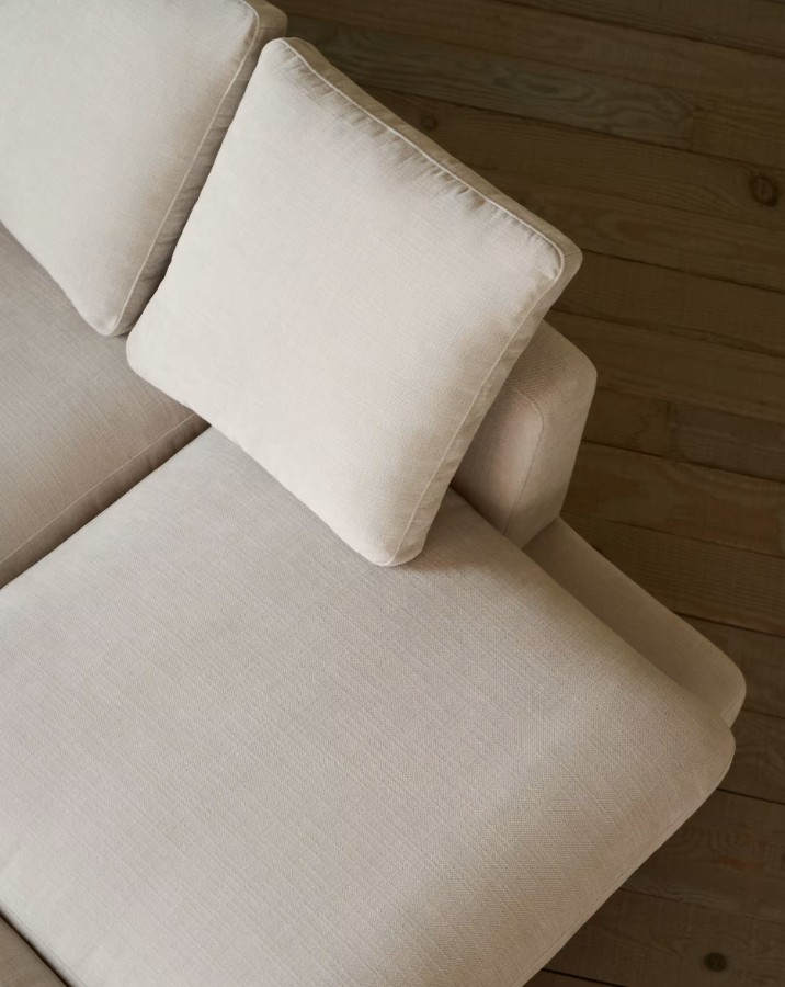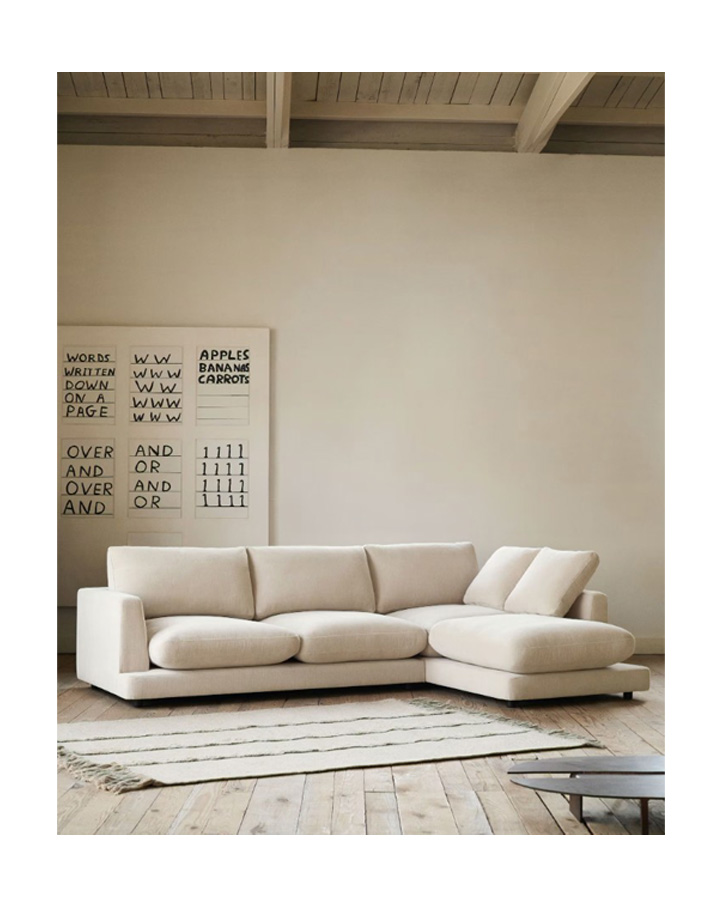 O Sofá Gala tem 4 lugares com encosto e capa reversivel. O sofá é feito em tecido chenille de elevada qualidade e enchimento com efeito pluma que confere um estilo minimal à sua sala.