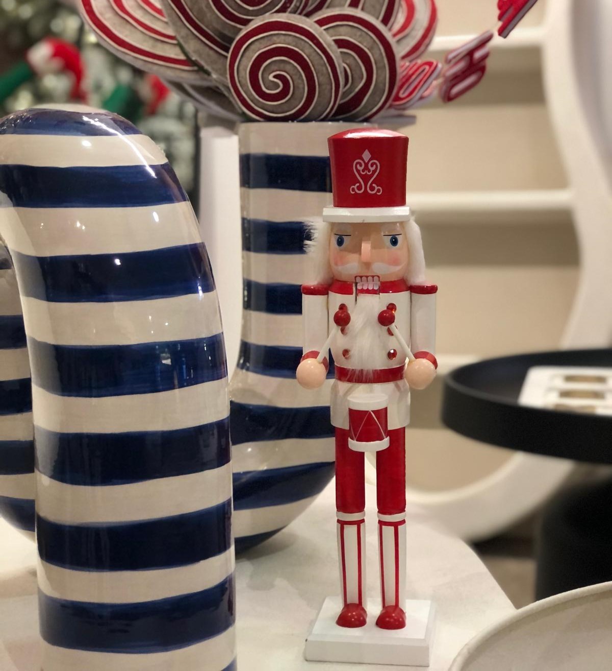 Soldado tambor é feito em madeira na cor vermelha e branca, ideal para quem gosta de uma decoração mais simplista e moderna