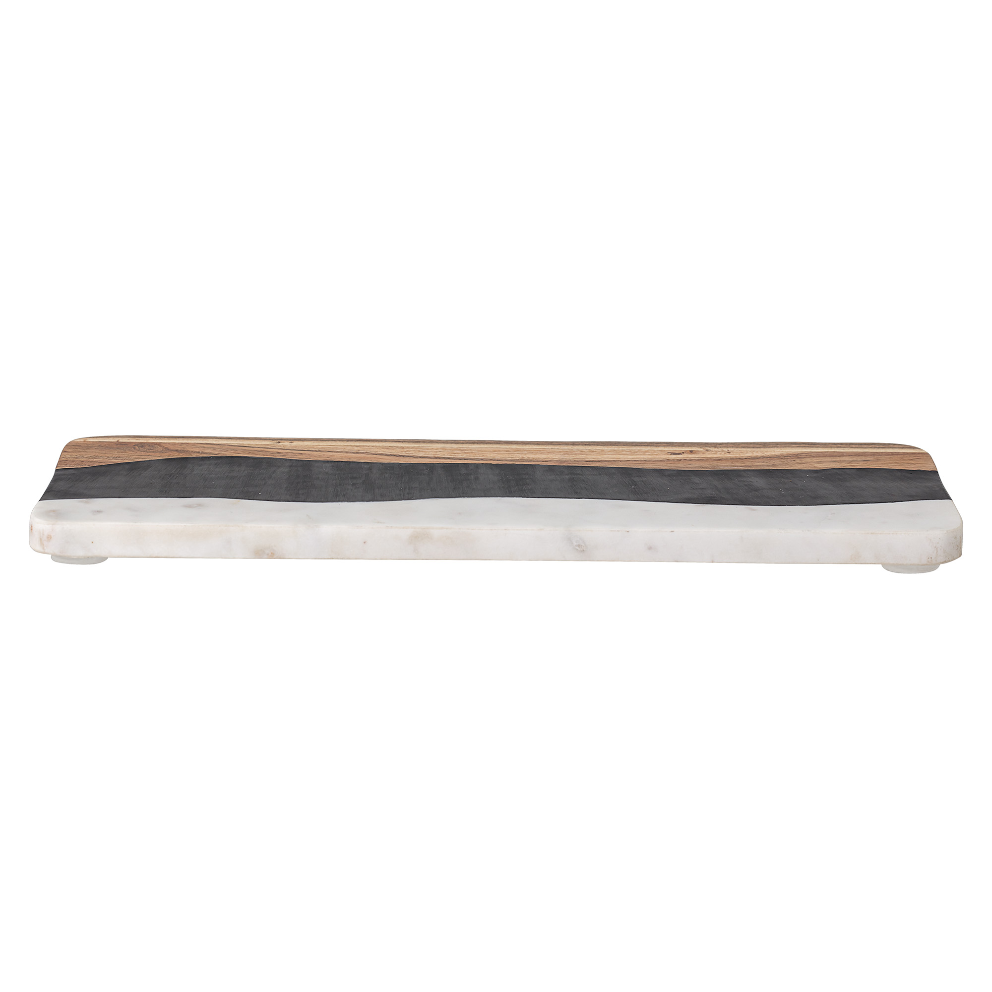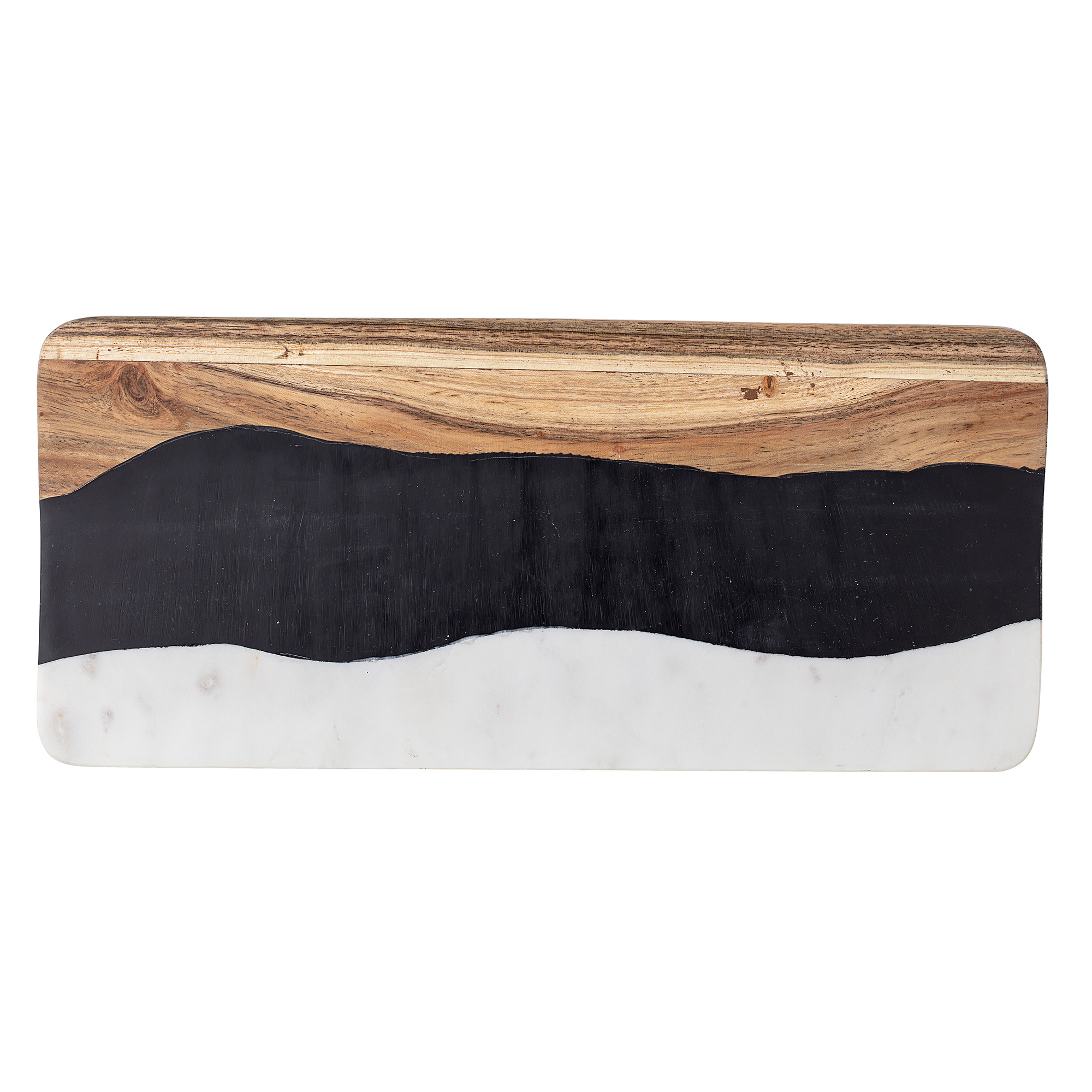 Tábua de corte com uma mistura de acácia, mármore e resina, o que lhe dá um visual interessante e moderno.