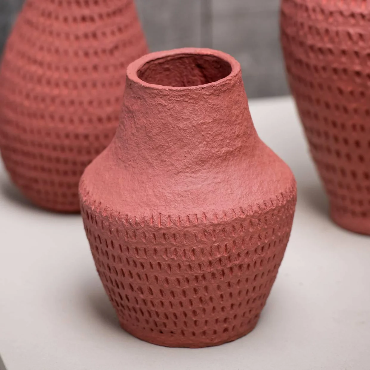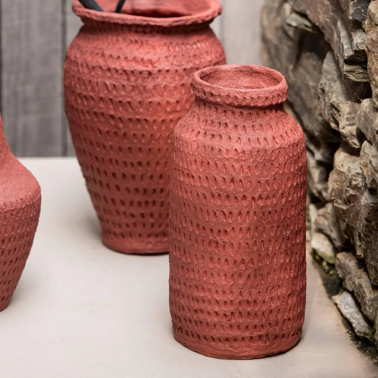 Vaso de terracota vermelha feito de algodão machê. Esta técnica é ecologicamente correta, pois se baseia na técnica do papel machê, mas utiliza sobras de algodão da indústria da moda. É uma peça ecológica e 100% biodegradável. Este vaso decorativo tem formato de garrafa e apresenta uma gravação irregular em toda a sua superfície. É importante não enchê-lo com água ou deixá-lo ao ar livre, pois é biodegradável e pode danificá-lo.
