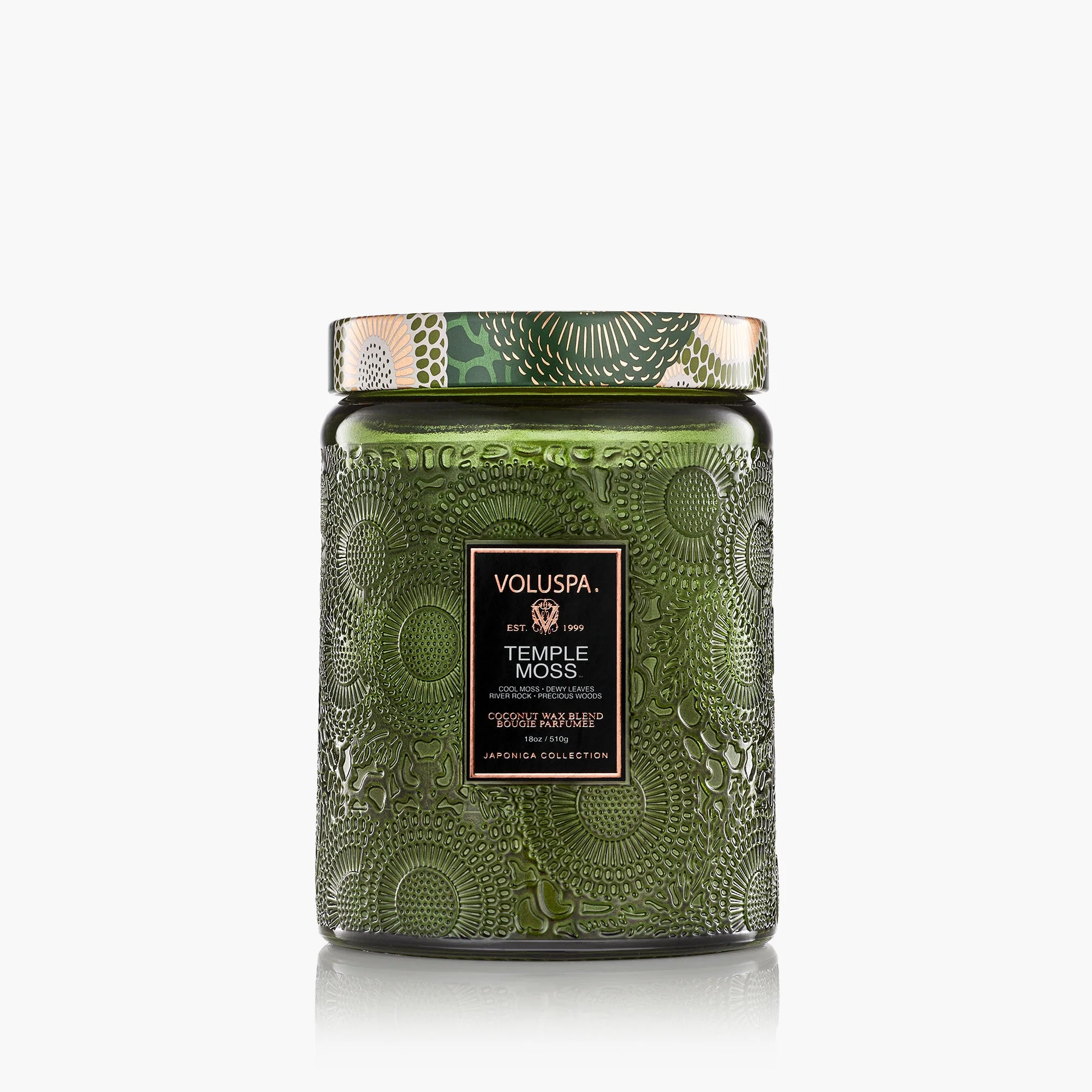 A Voluspa convida você a buscar conforto no chão da floresta. Fundido nas notas curativas de musgo fresco, folhas orvalhadas, pedras molhadas e sol quente espreitando através do matagal de galhos de Hinoki. A própria Mestre Perfumista, a Mãe Natureza, irá guiá-lo à tranquilidade através de imagens, sons e aromas rítmicos de sua floresta exuberante. Todos são bem-vindos para passear pelos jardins aromáticos de Temple Moss.